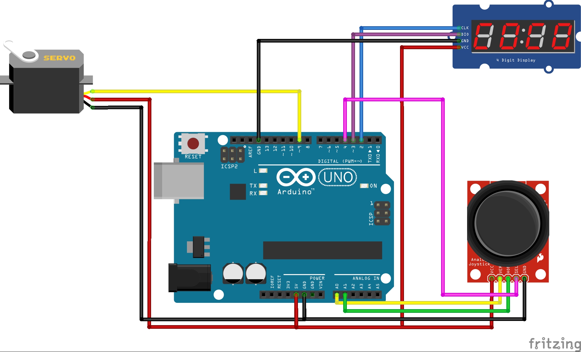 * 조이스틱(x축A0, y축A1, 버튼D4)으로 서보모터의 각도를 조절해라!