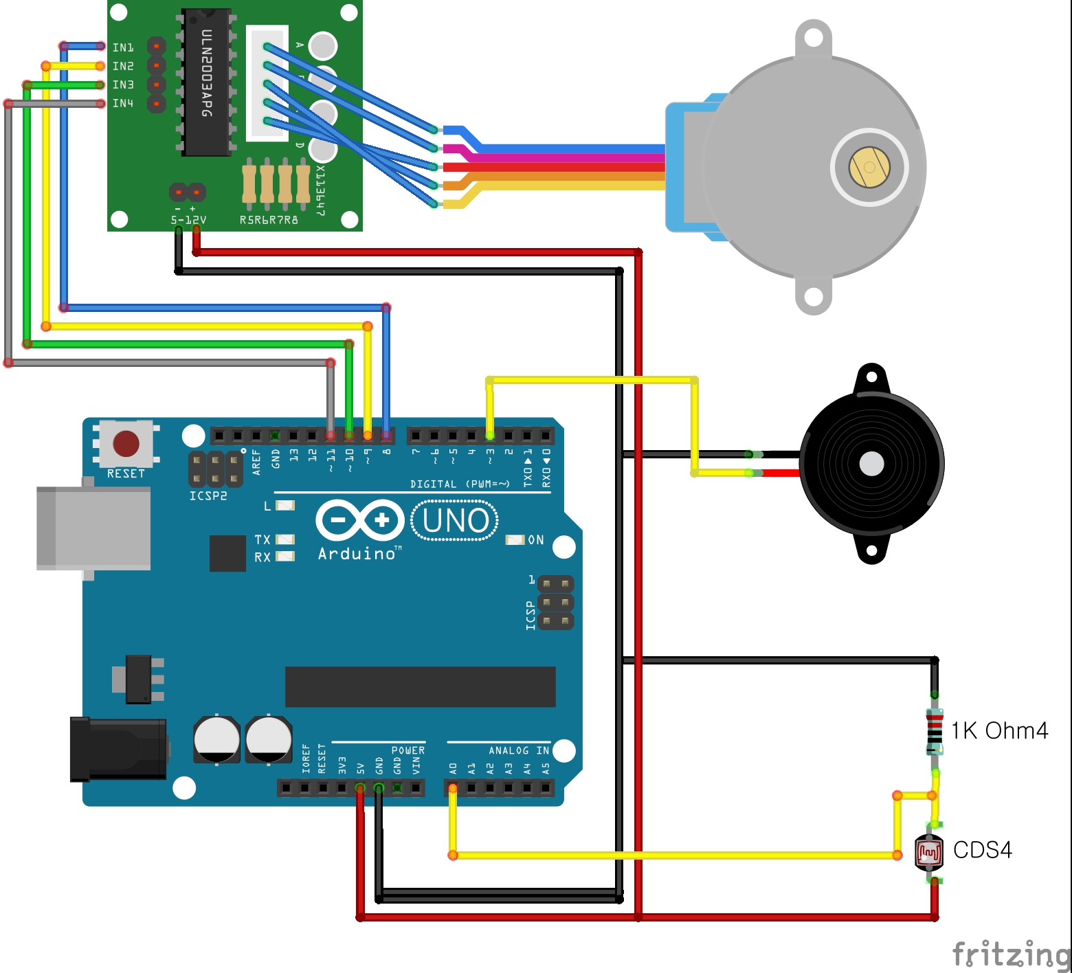 (스몰프로젝트) 광센서로 밤이 감지되면 피에조부저로 신나는 음악이 재생되면서 창문에 커튼을 치도록 하시오! (커튼을 치는 것은 실제로 할 수 없으므로 스탭모터를 일정량 회전하는것으로 대체)