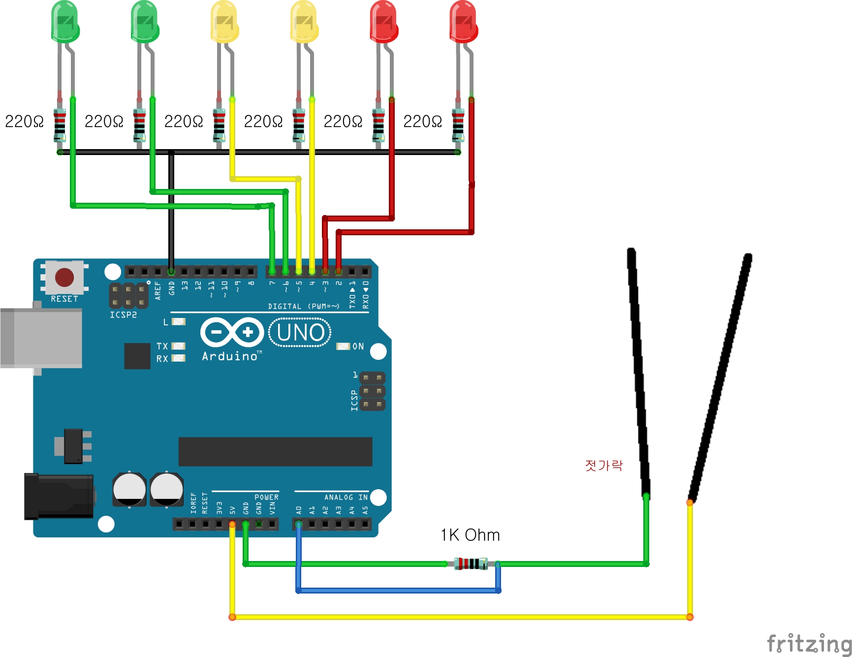 * LED를 D2(빨),D3(빨),D4(노),D5(노),D6(녹),D7(녹)에 연결하고
