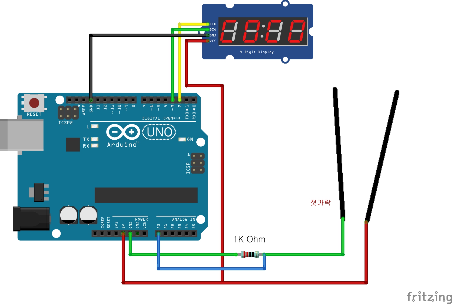 * FND디스플레이는 TMI1637이고 CLK를 D2 DIO를 D3에 연결했다.