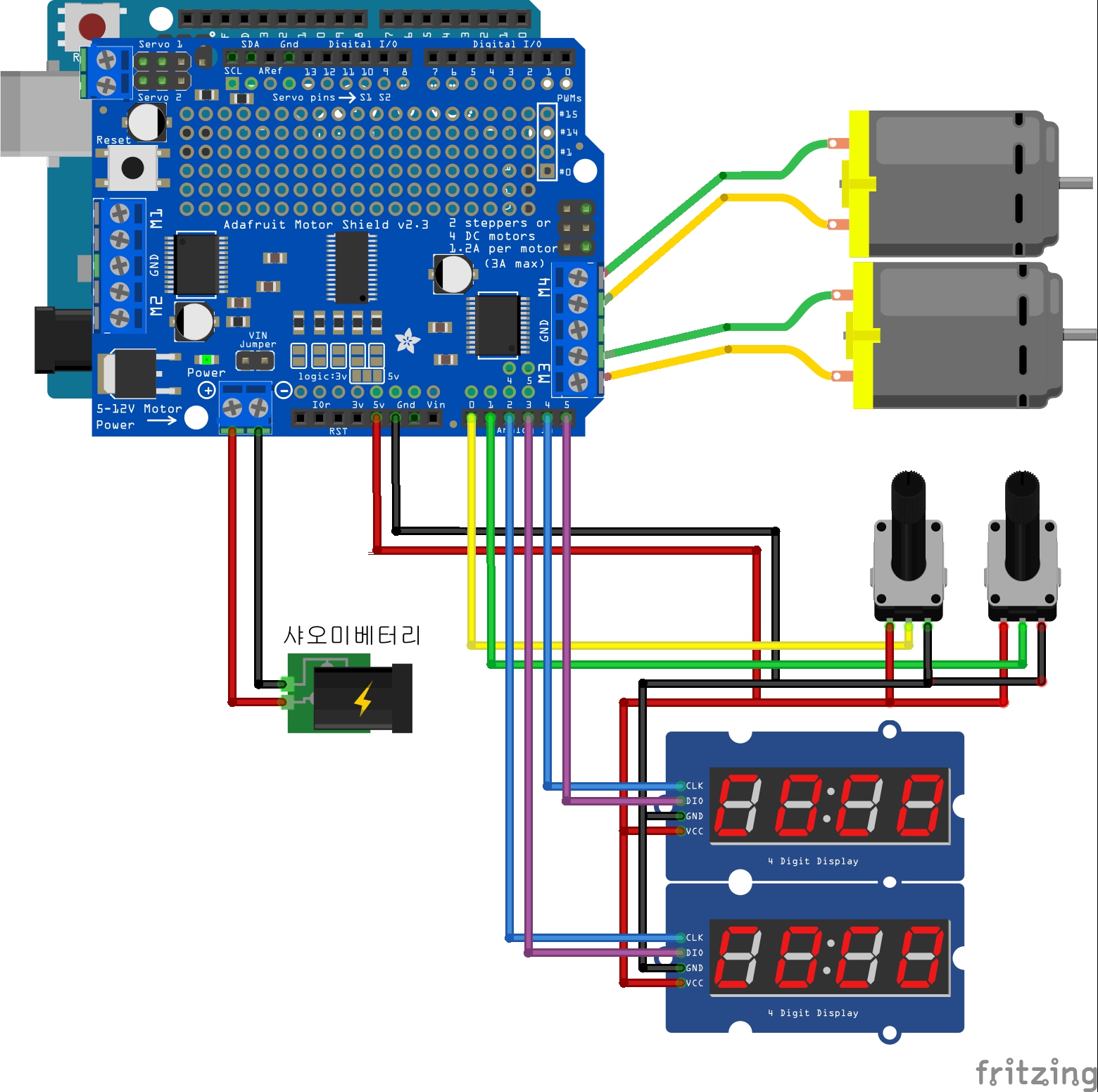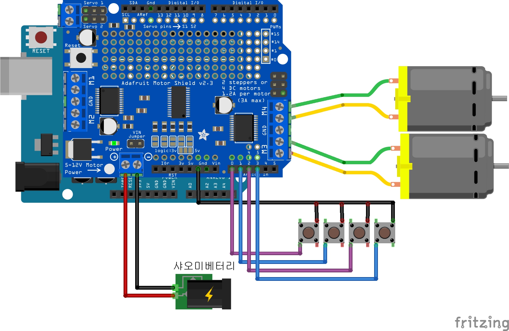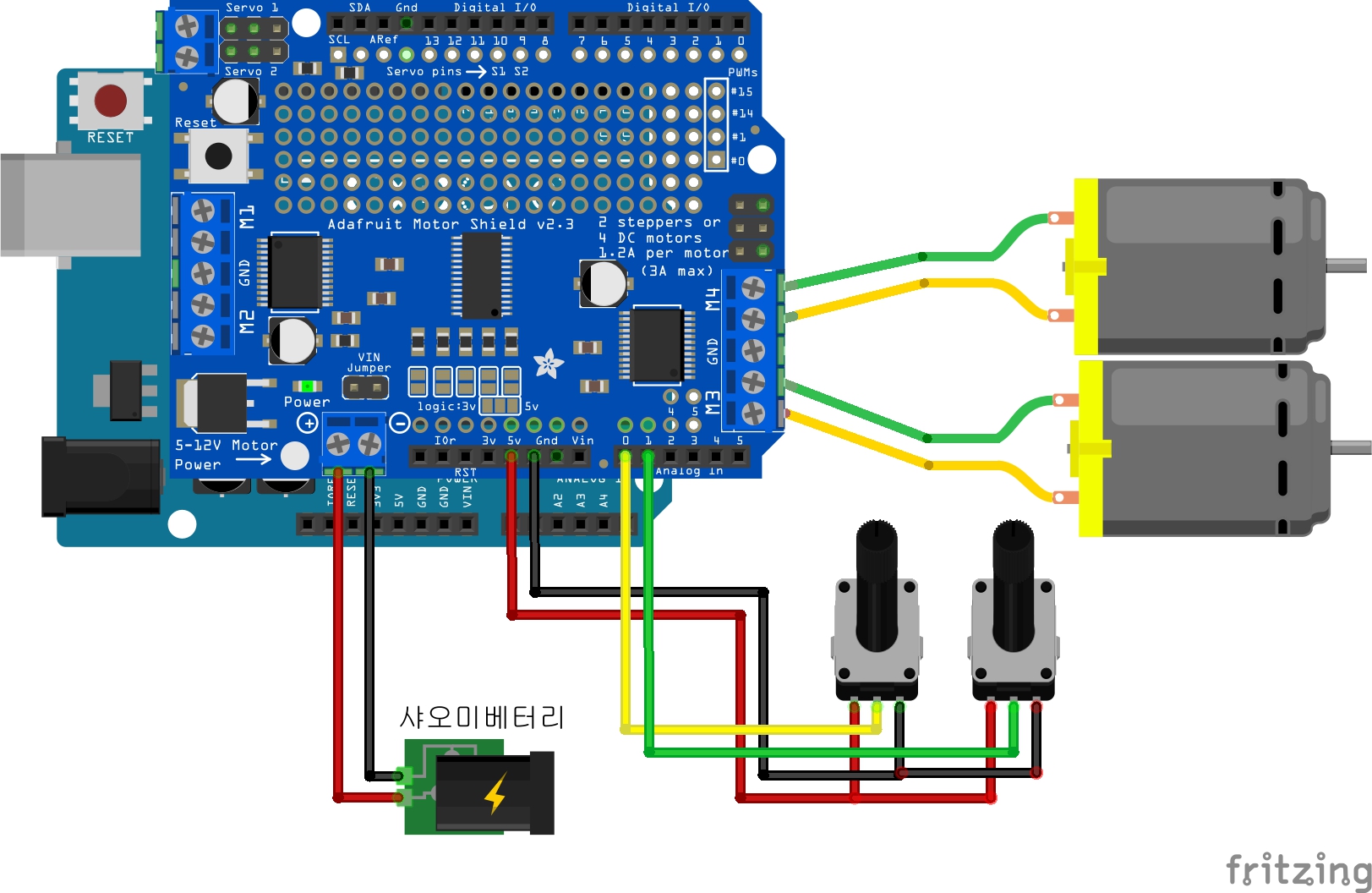 * DC모터는 모터드라이브 M3과 M4에 연결되어있고