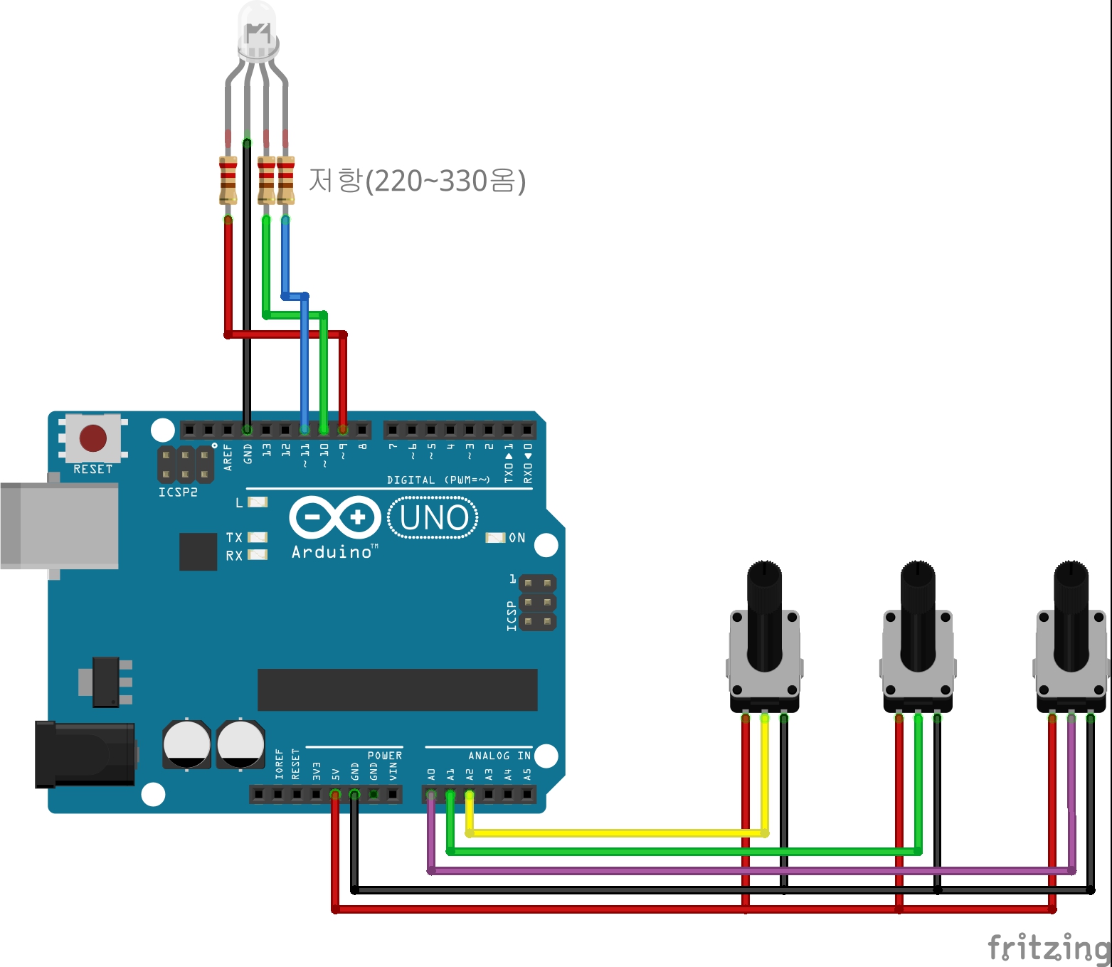 * 가변저항3개를 A0,A1,A2에 연결해서 컬러조절하기!
