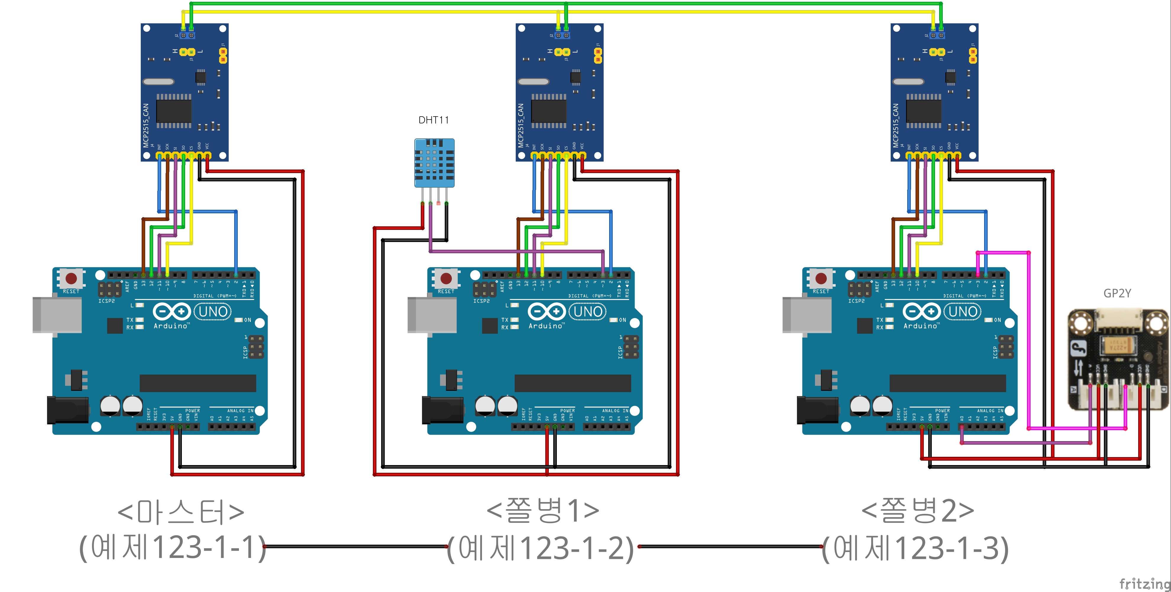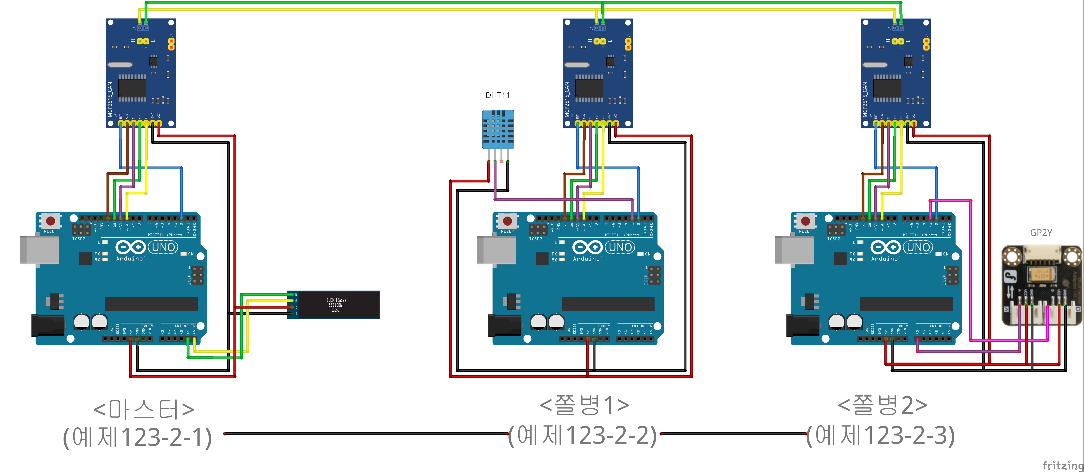마스터 아두이노 1개와 슬레이브 아두이노 2개를 1:2로 연결(MCP2515)