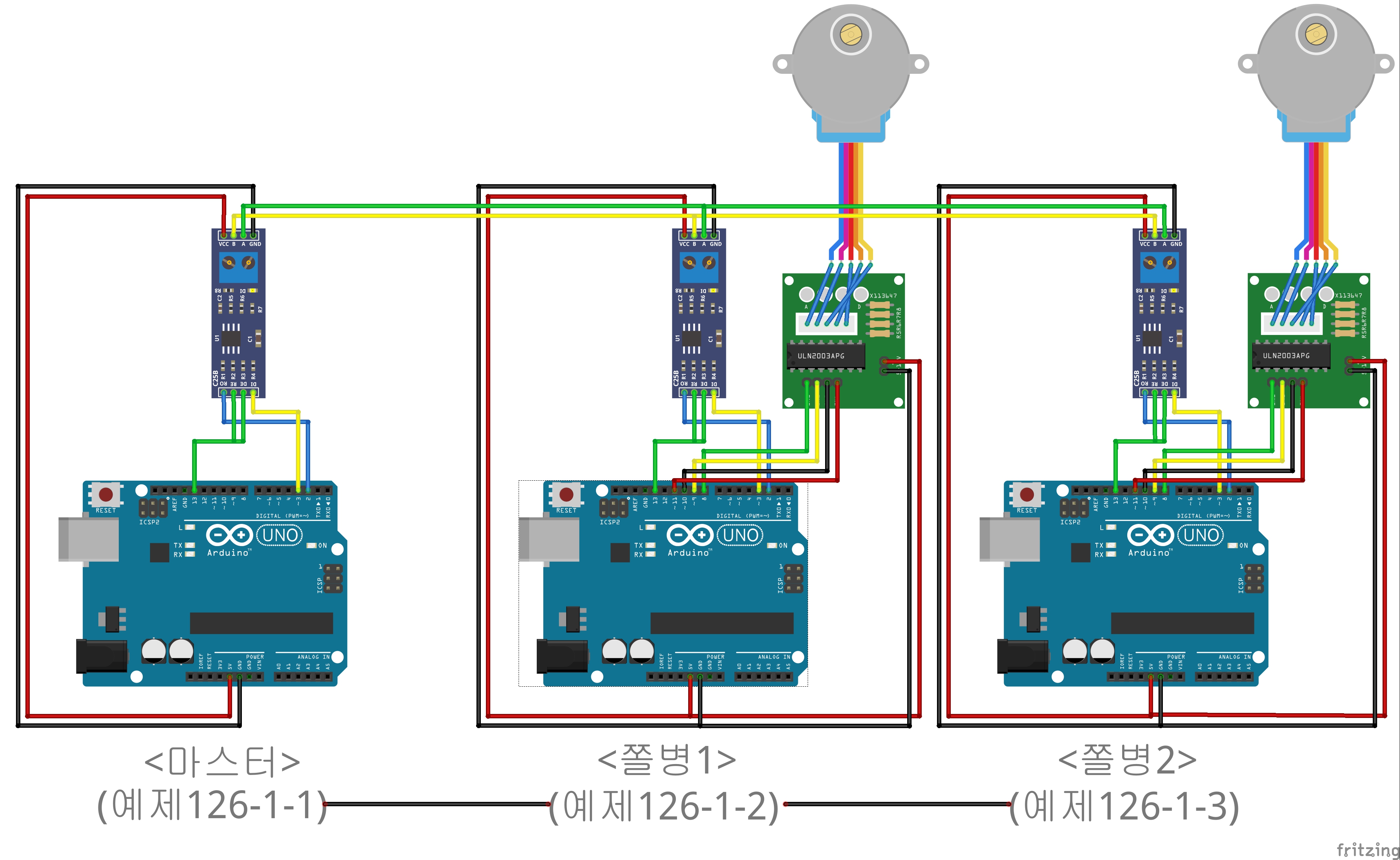 마스터 아두이노 1대와 슬레이브 아두이노 2대로 1:1 연결!