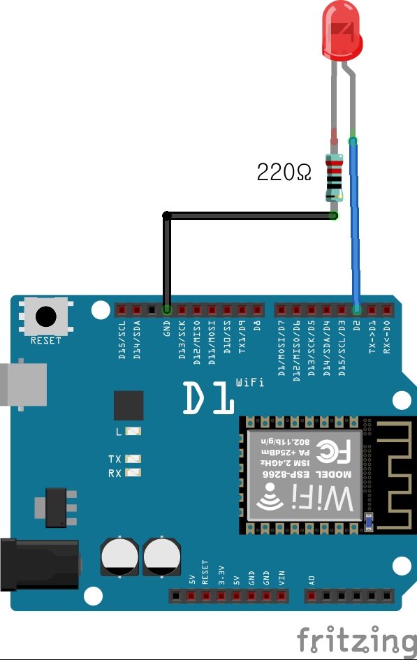 wemos 디지털 2번 포트에 LED를 하나 연결한다!