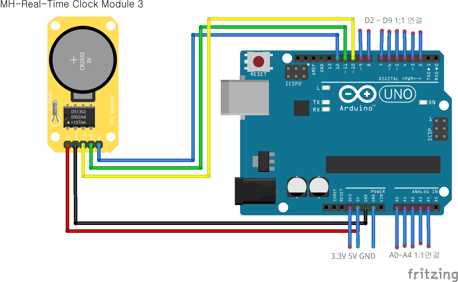 * DS1302모듈을 CLK를 10번에 DAT를 11번에 RST를 12번에 연결했다!