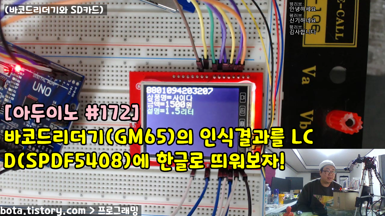 [아두이노#172] 바코드리더기(GM65)의 인식결과를 2.4인치 LCD쉴드(SPDF5408)에 한글로 띄워보자!(녹칸다/포로리야공대가자)