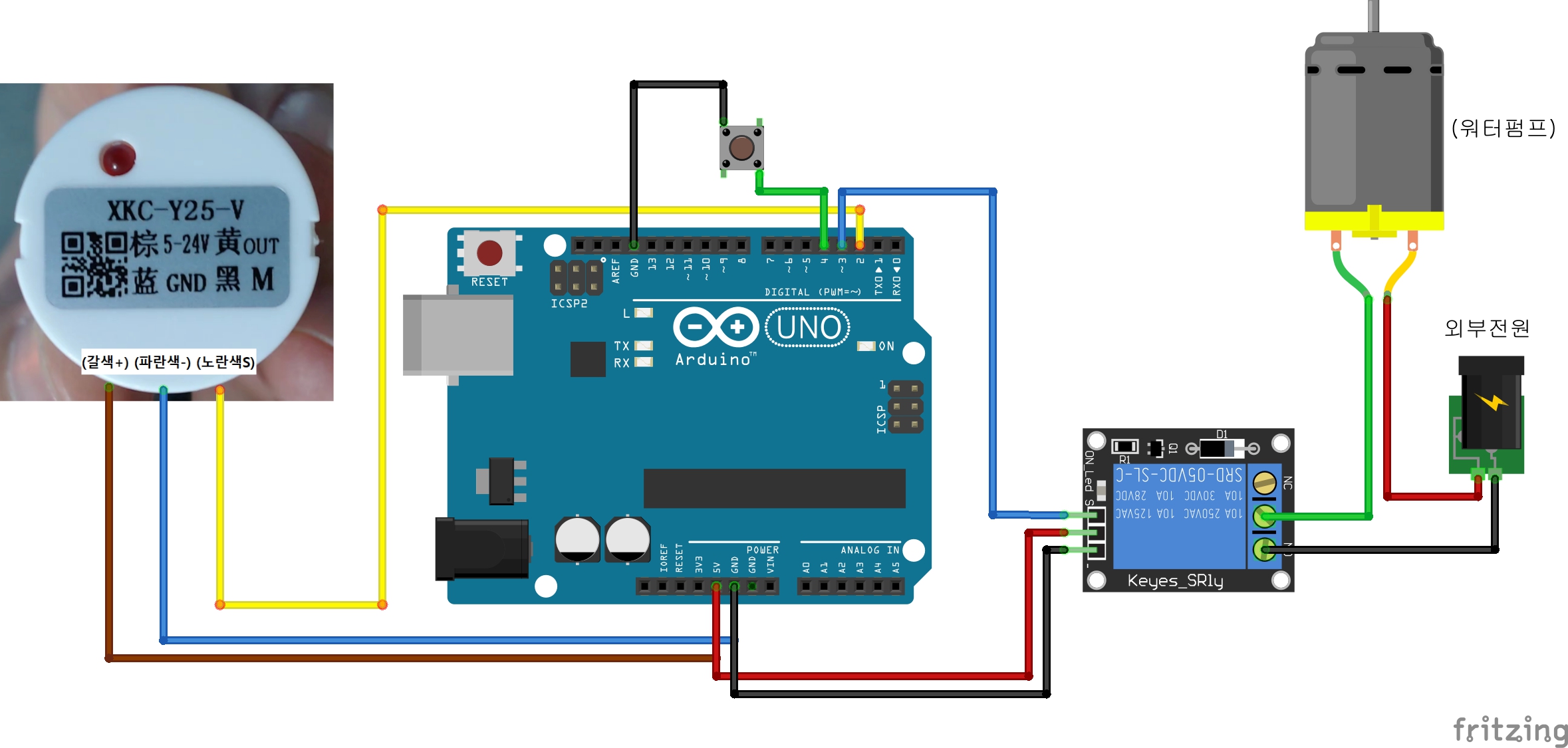 * 워터펌프를 직접 아두이노에 연결할 수 없기에 모스펫(mosfet)을 D3에 연결하고 모스펫에 워터펌프를 연결했다!