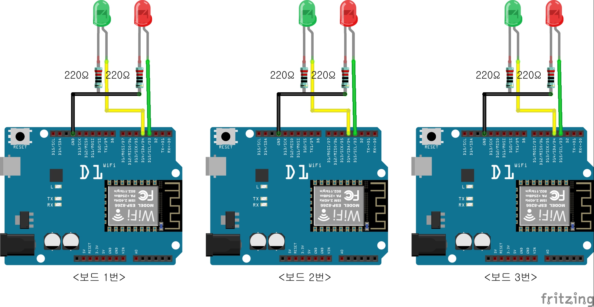 예제 202-1-1 (보드1번용코드) 사물인터넷보드(wemos d1r1)에 적색 LED 1개를 D3에 연결했고, 녹색 LED 1개를 D4에 연결했다!