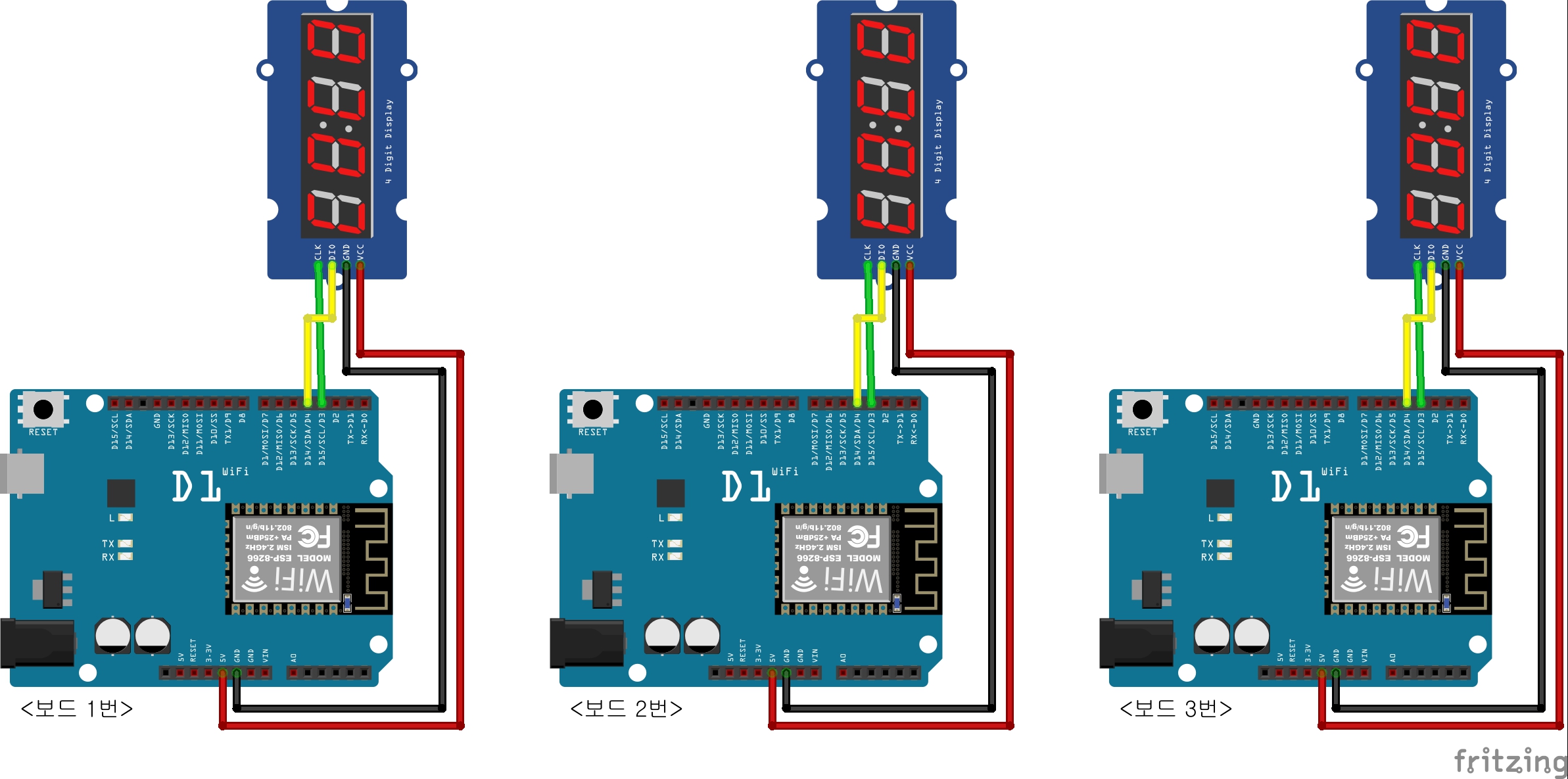 -스마트폰에서 사물인터넷보드 3개에 각각 달린 FND모듈(TM1637)을 개별적으로 제어가능하도록하고 일괄적으로 제어가능하도록 구현하라!