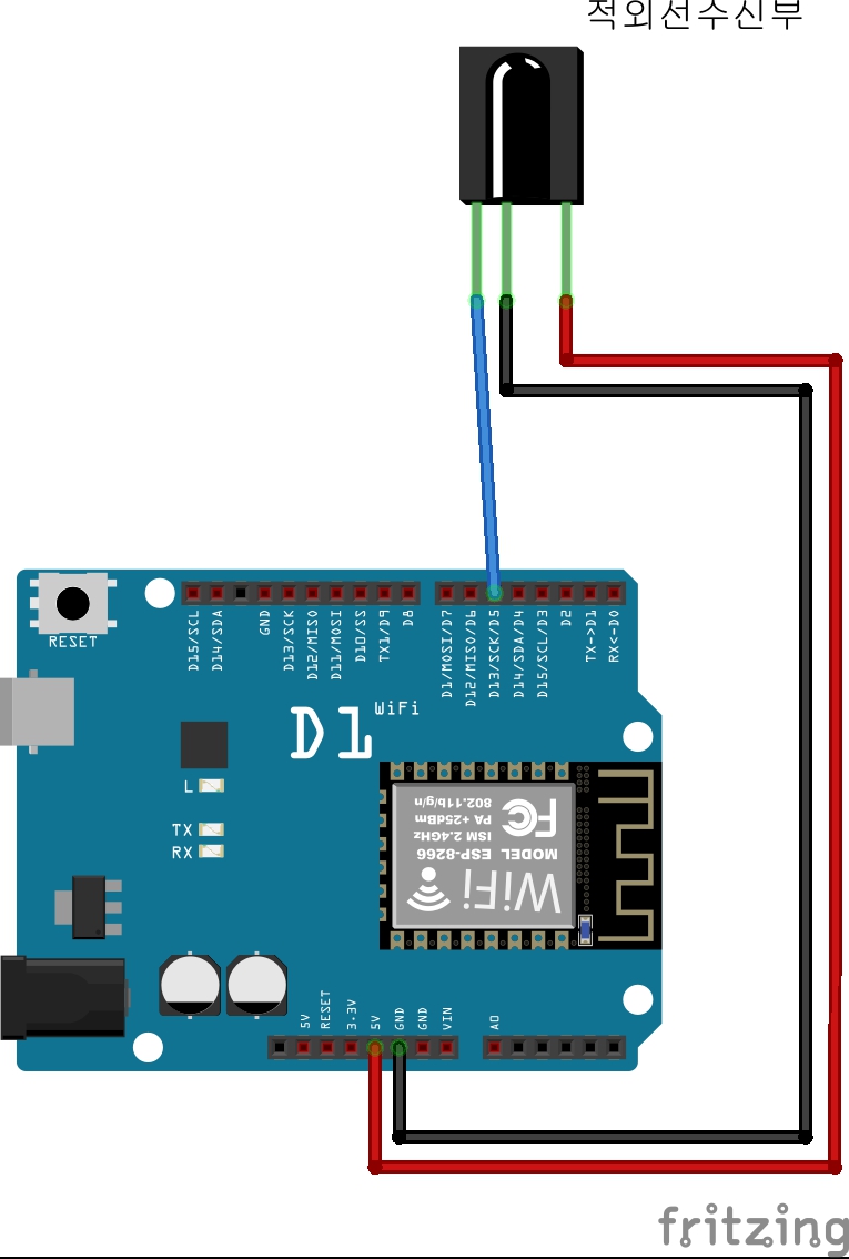 예제207-4 사물인터넷보드(wemos d1r1)에 IR리모컨 수신부를 D5에 연결했다!
