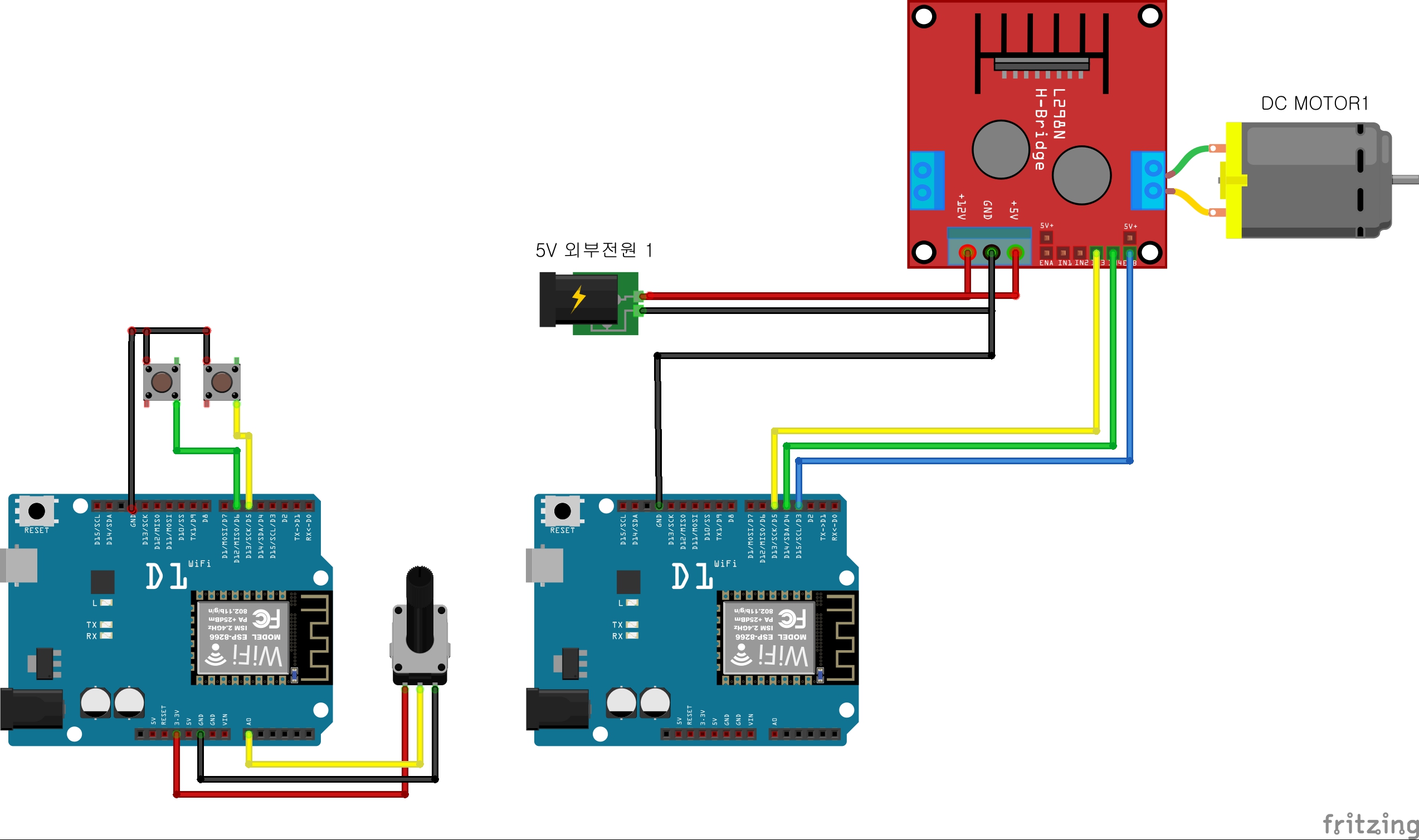-1번보드에서 방향전환버튼 2개와 가변저항을 이용해서 2번보드에 달란 모터드라이버(L298N)를 제어하라!(모터드라이버에는 USB모터를 달아보자)