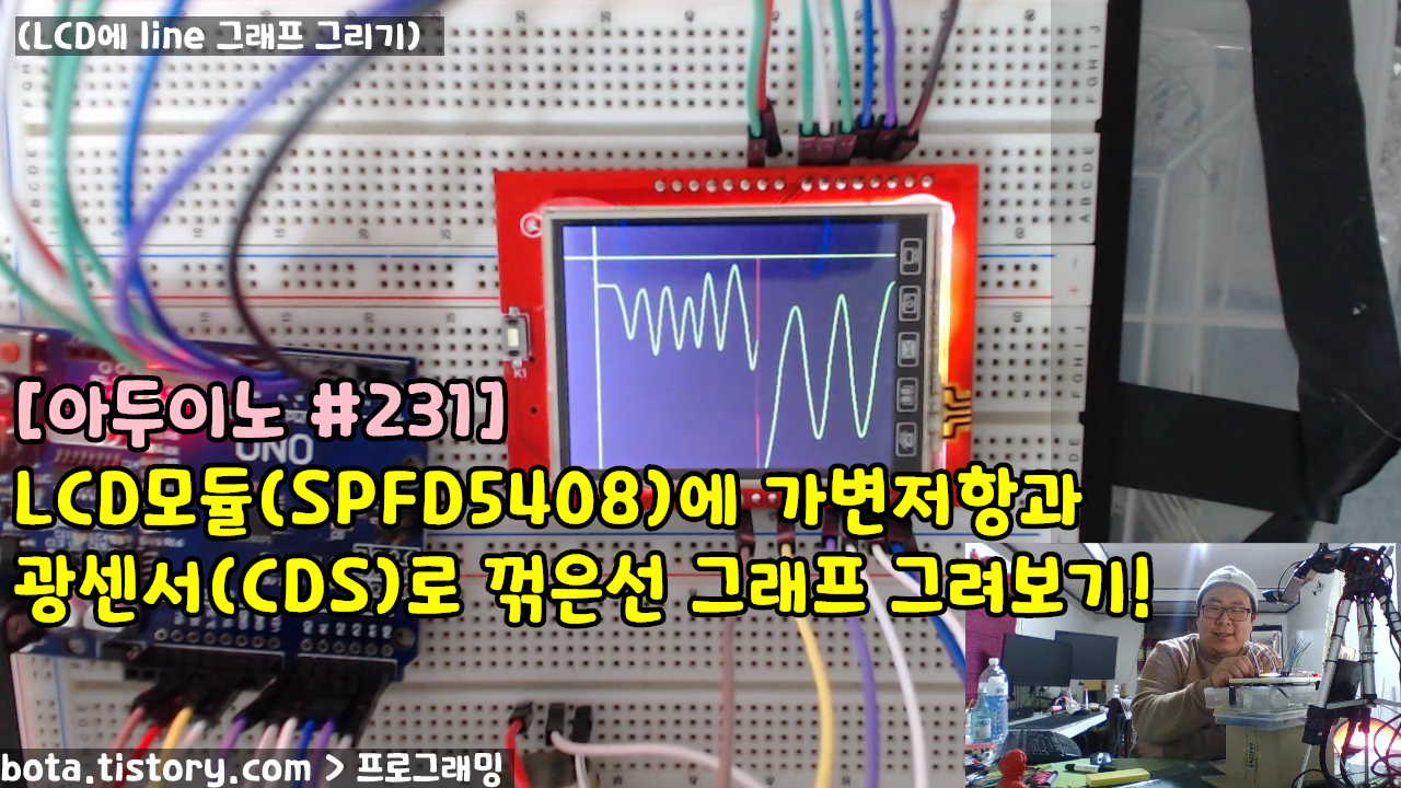 [아두이노#231] LCD모듈(SPFD5408)에 가변저항과 광센서(CDS)로 꺾은선 그래프 그려보기!(녹칸다/포로리야공대가자)