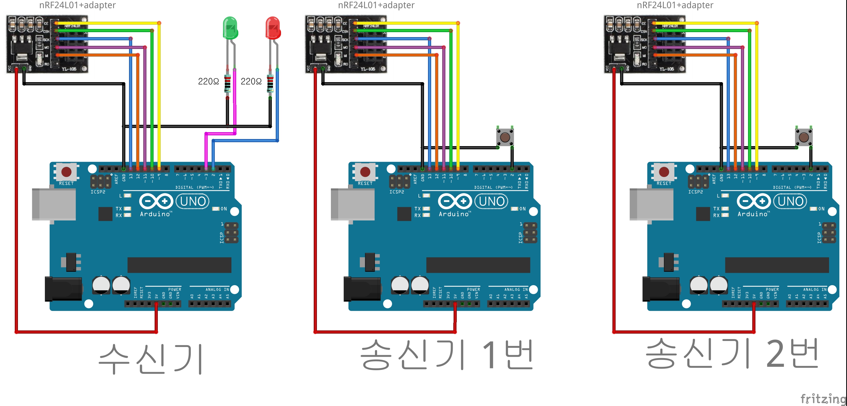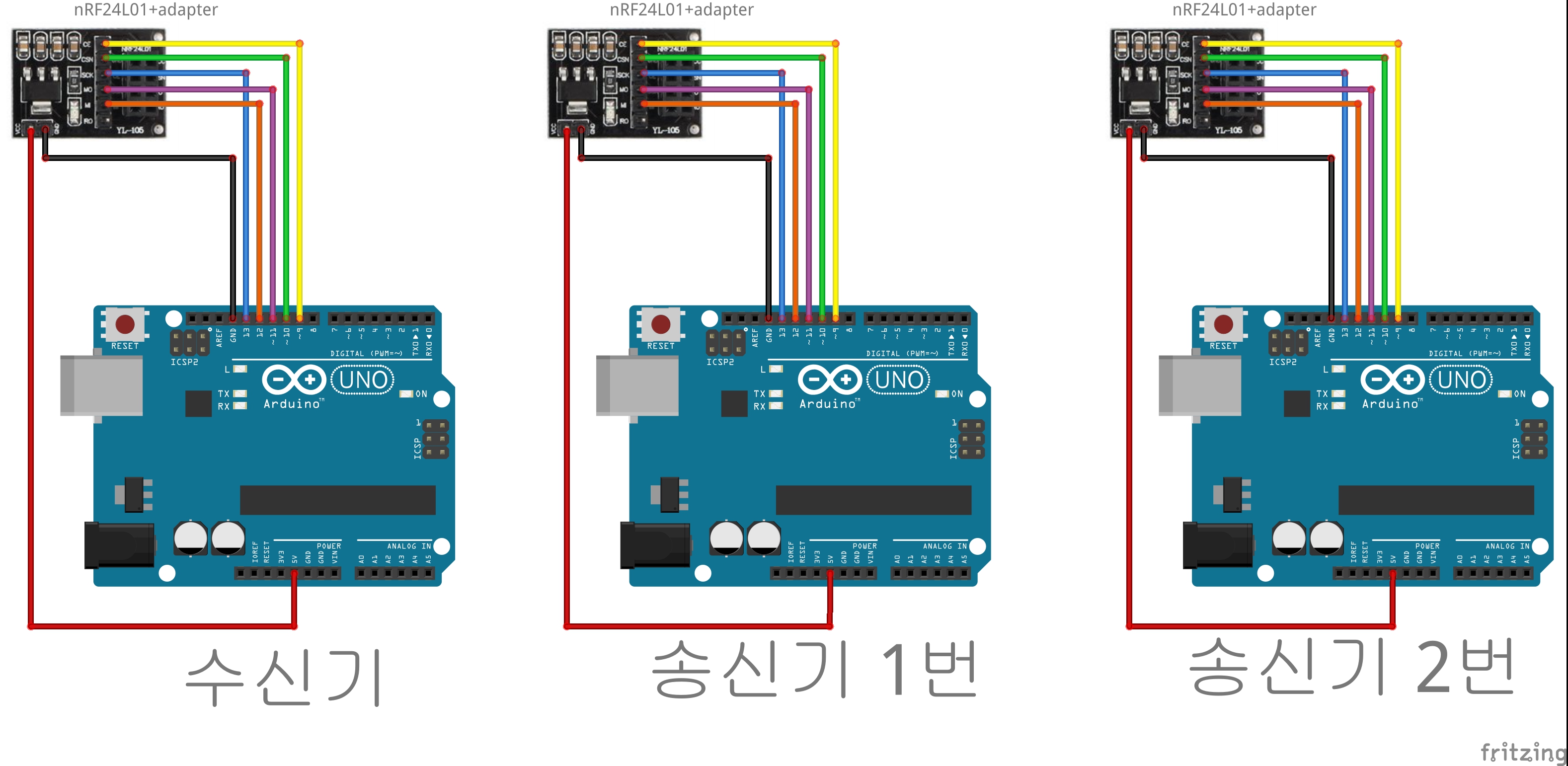 -이번 시리즈는 nRF24L01을 이용한 1:2단방향 무선통신으로 트랜스미터(송신기) 2개에서 보낸 정보를 리시버(수신기) 1개에 수집하는 것을 목표로 한다!