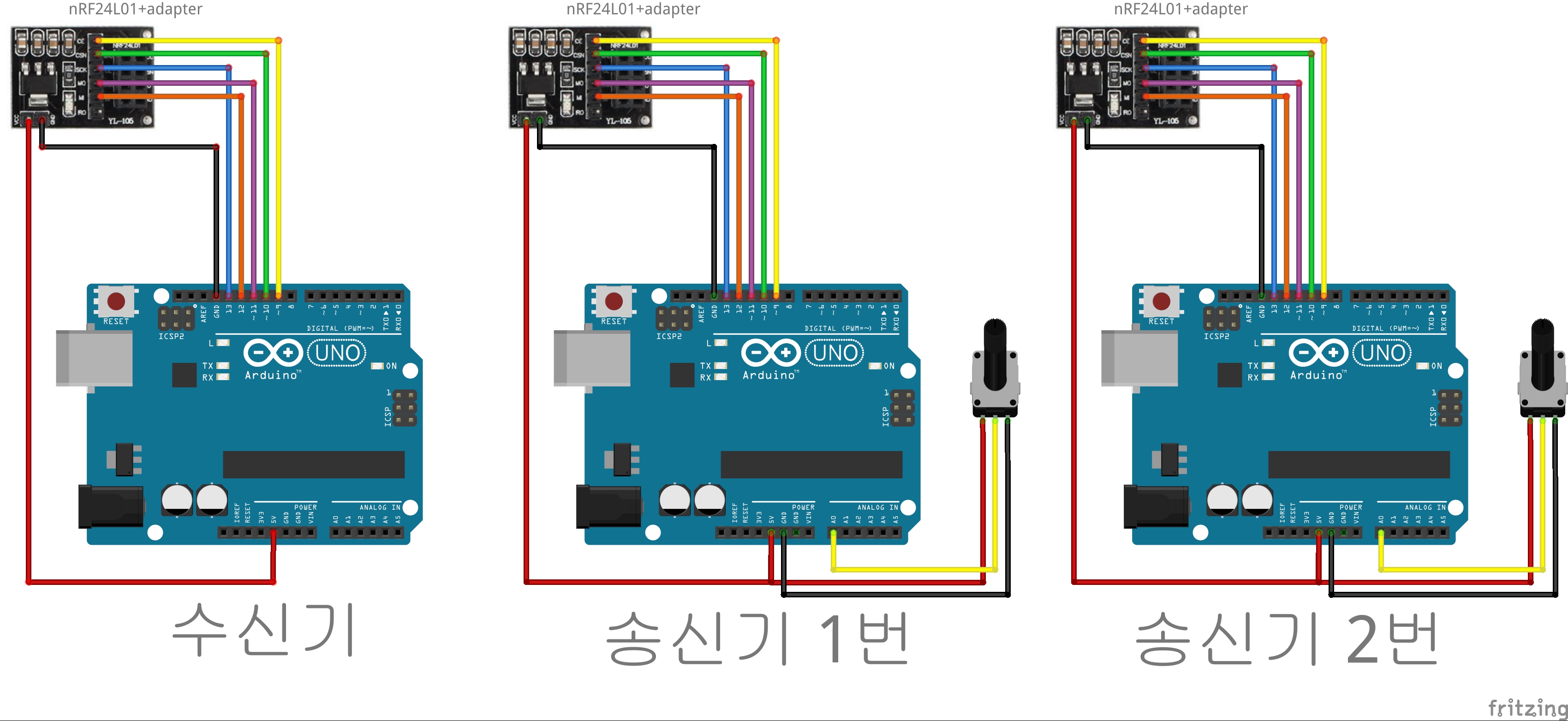 -이번 시리즈는 nRF24L01을 이용한 1:2단방향 무선통신으로 트랜스미터(송신기) 2개에서 보낸 정보를 리시버(수신기) 1개에 수집하는 것을 목표로 한다!