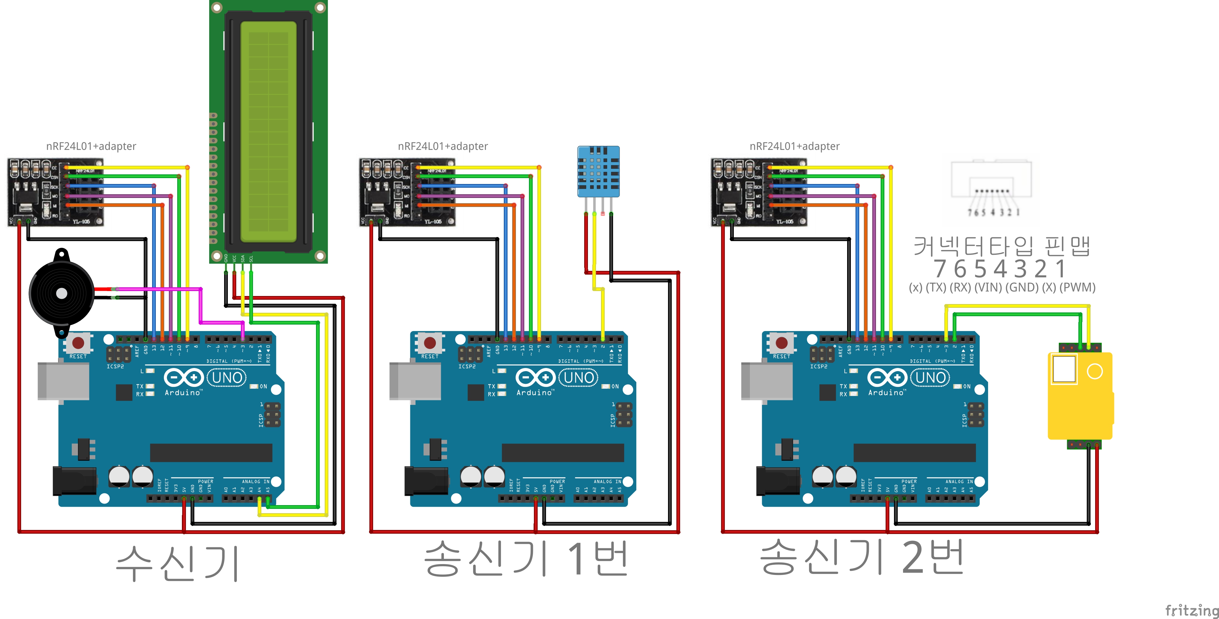 -이번 시리즈는 nRF24L01을 이용한 1:2단방향 무선통신으로 트랜스미터(송신기) 2개에서 보낸 정보를 리시버(수신기) 1개에 수집하는 것을 목표로 한다!