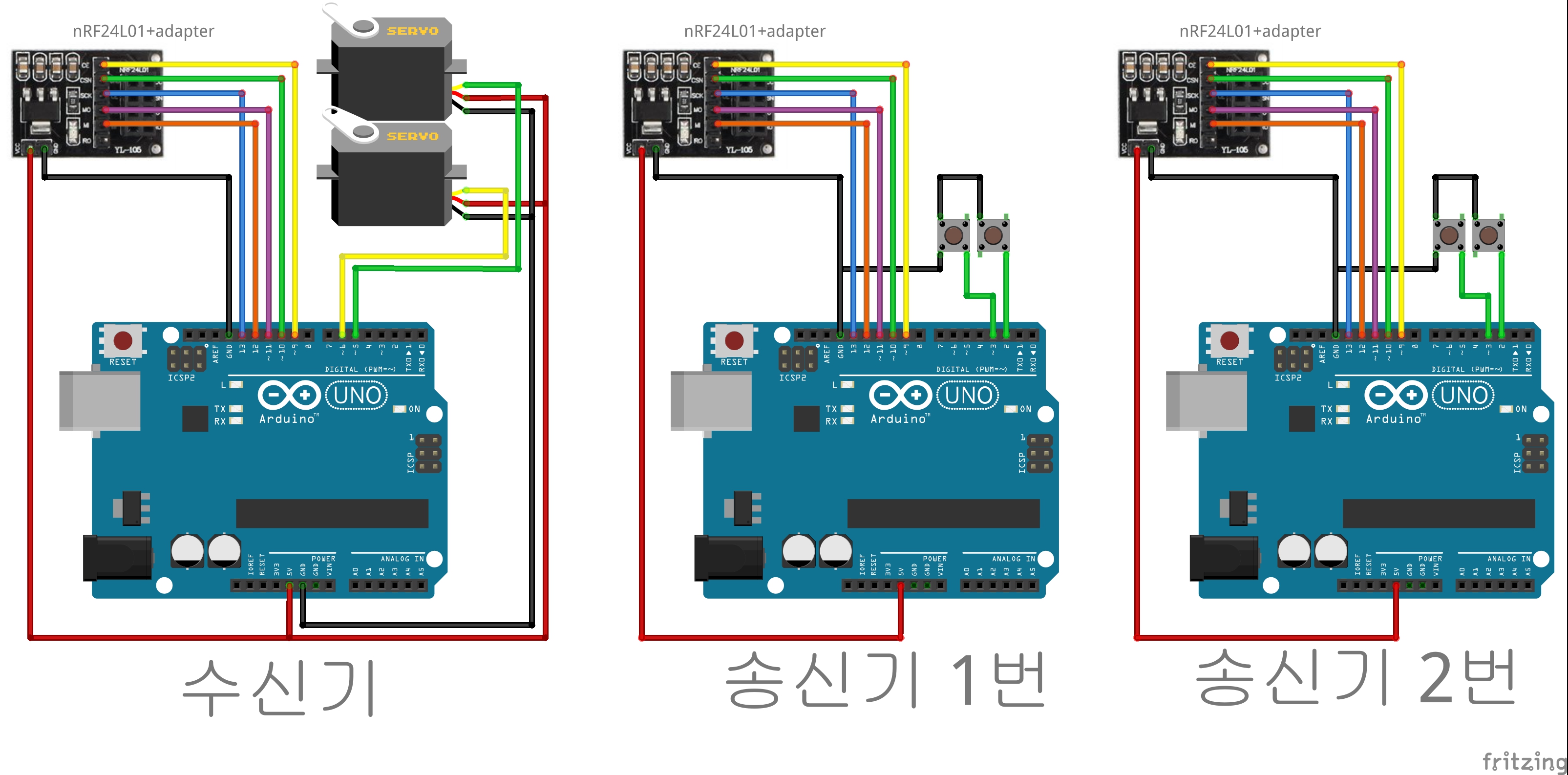 -(예제1) A와 B에 버튼을 2개씩 연결한다! C에 서보모터(SG90)를 2개 연결한다! A에서 업/다운 버튼을 누르면 C의 첫번째 서보모터 각도가 nRF24L01를 이용해서 제어된다! B에서 업/다운 버튼을 누르면 C의 두번째 서보모터 각도가 제어된다!