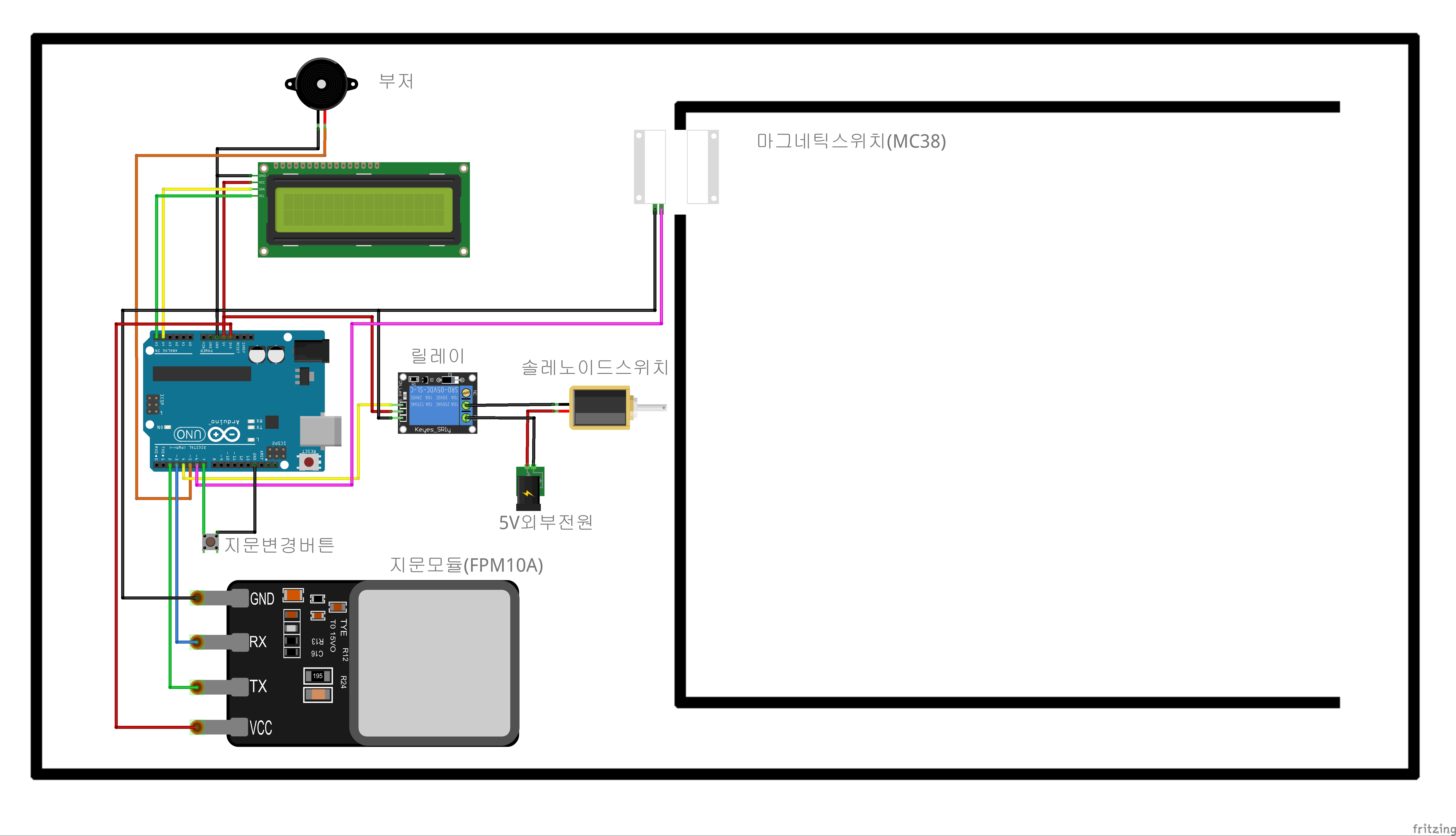 -이번편은 아두이노, 지문인식모듈(FPM10A),버튼(택트스위치), 1602LCD, 부저, 마그네틱스위치(도어센서), 릴레이, 솔레노이드 스위치를 이용해서 실제에 가깝게 구현해볼 생각이다!