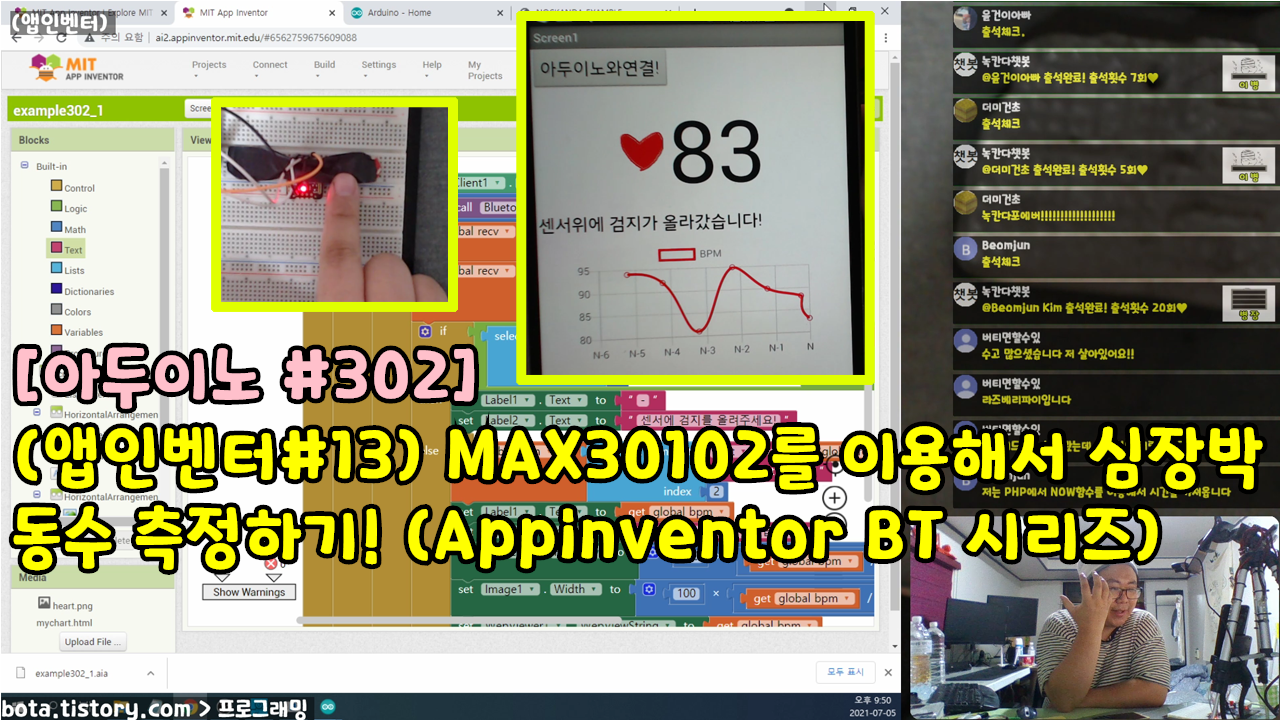 [아두이노#302] (앱인벤터#13) MAX30102를 이용해서 심장박동수 측정하기! (Appinventor BT 시리즈/녹칸다/포로리야공대가자)