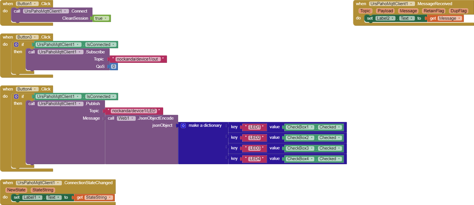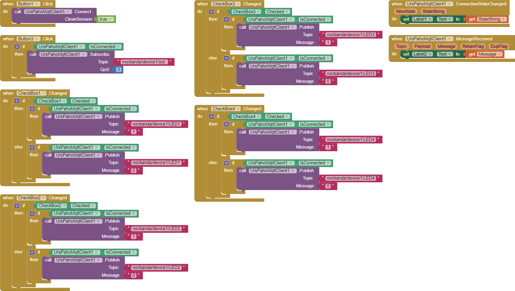 3.보드에 LED 4개가 있다! 아주 간단한 부호를 이용해서 앱인벤터에서 MQTT로 보드에 달린 LED를 개별적으로 제어해보라!