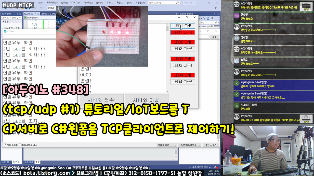 [아두이노#348] (tcp/udp #1) 튜토리얼/IoT보드를 TCP서버로 C#윈폼을 TCP클라이언트로 제어하기!(녹칸다/포로리야공대가자)