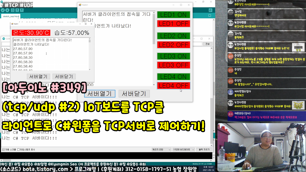 [아두이노#349] (tcp/udp #2) IoT보드를 TCP클라이언트로 C#윈폼을 TCP서버로 제어하기!(녹칸다/포로리야공대가자)