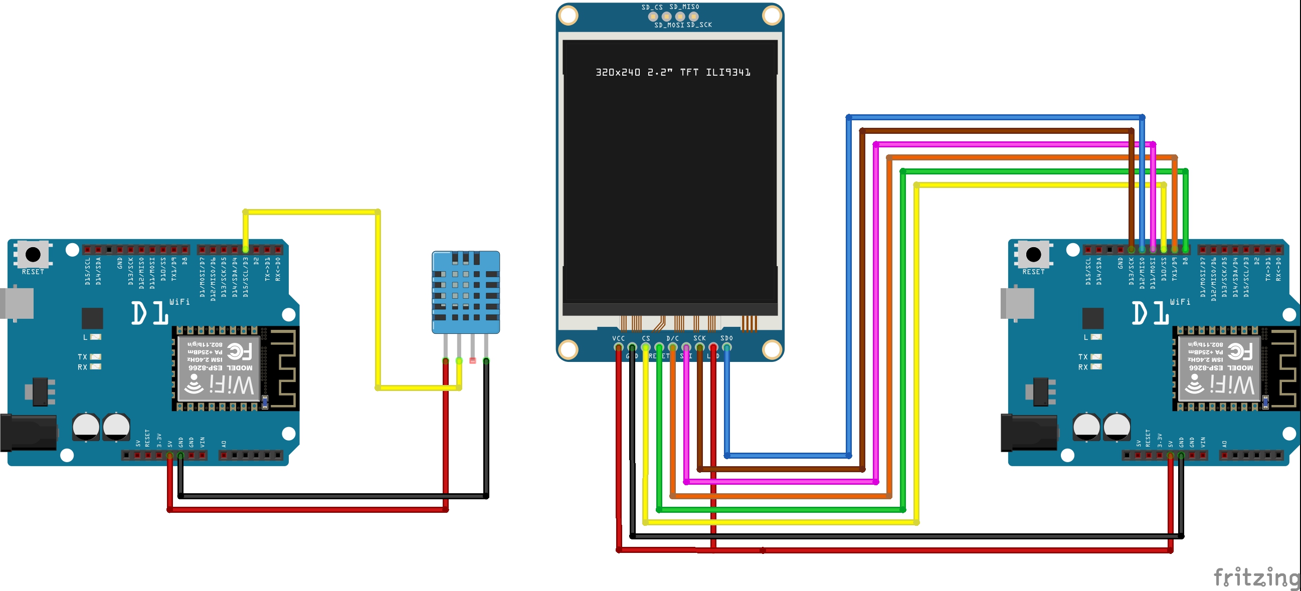 7. A에 온습도 센서를 연결하고 B에 2.4인치 LCD(ILI9341)를 연결하고 A의 온습도 값을 B의 LCD에 출력되도록 하시오!