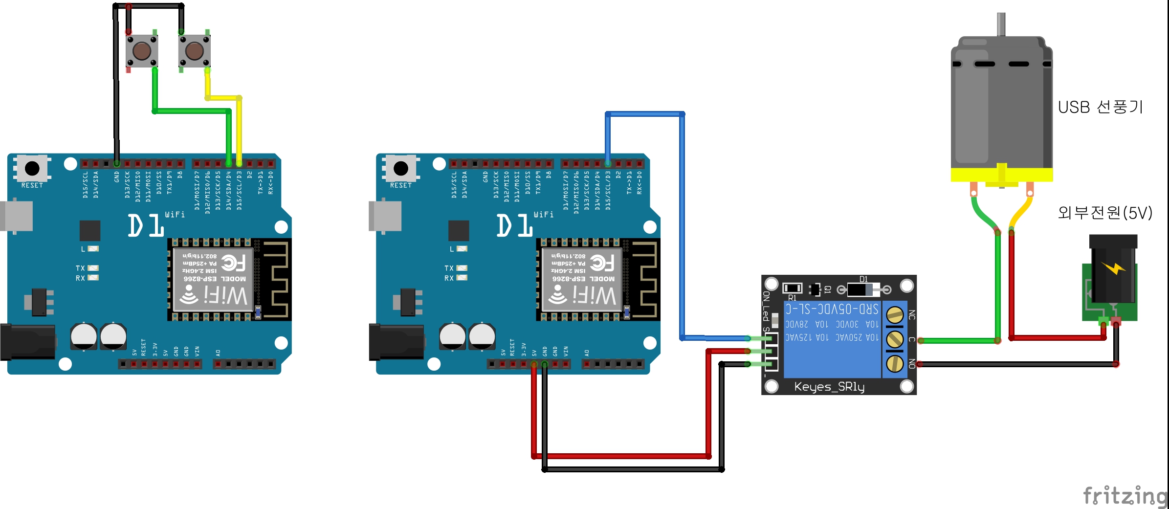2. A에 버튼 2개를 연결하고 B에 릴레이를 연결한다음 A가 버튼을 눌렀을때 B에 연결된 DC모터가 제어되도록 하시오!