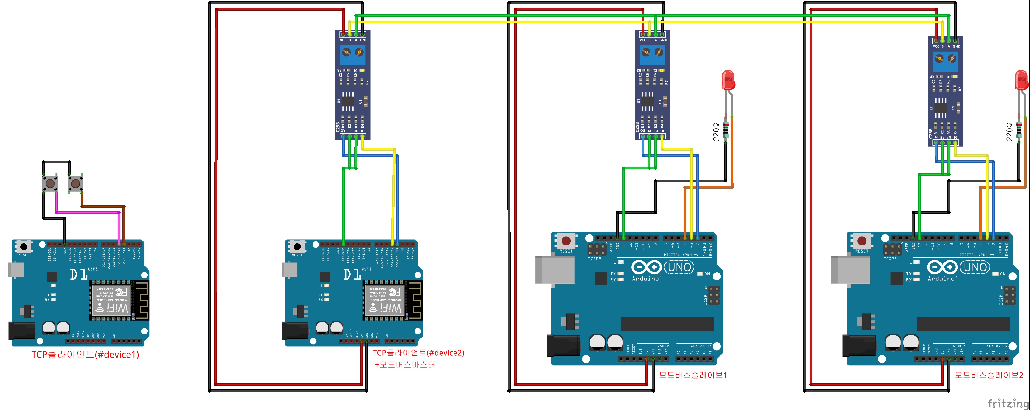 3.모드버스슬레이브 2대에 각각 LED를 1개씩 연결하고 TCP디바이스에서 버튼으로 제어하는 예제