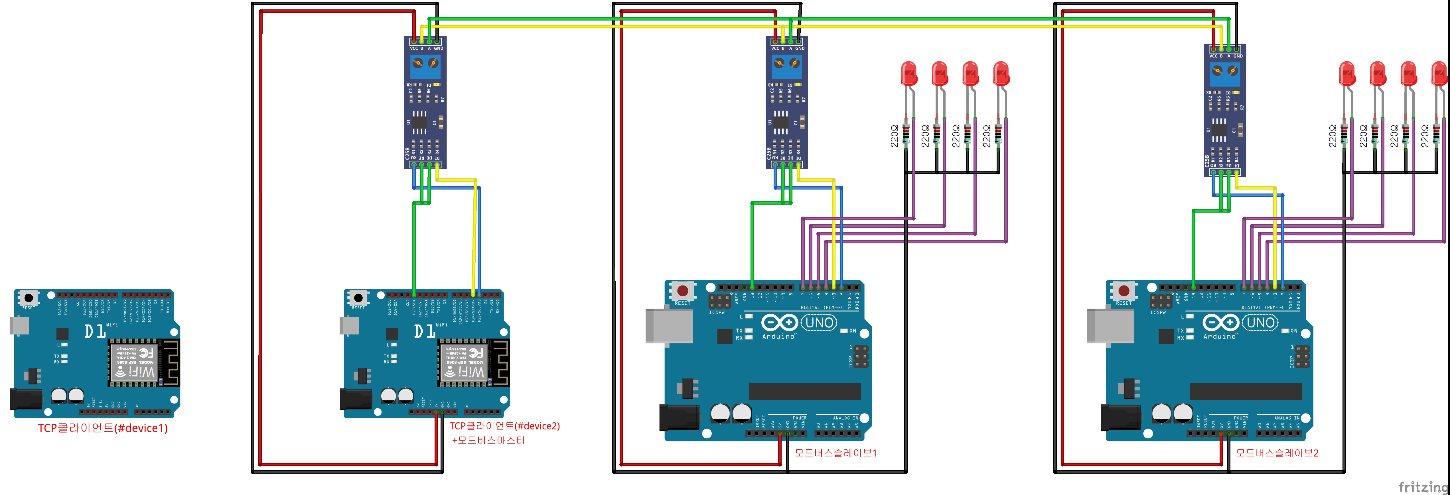 4.모드버스슬레이브 2대에 각각 LED를 4개씩 연결하고 TCp디바이스에서 시리얼입력으로 제어하는 예제