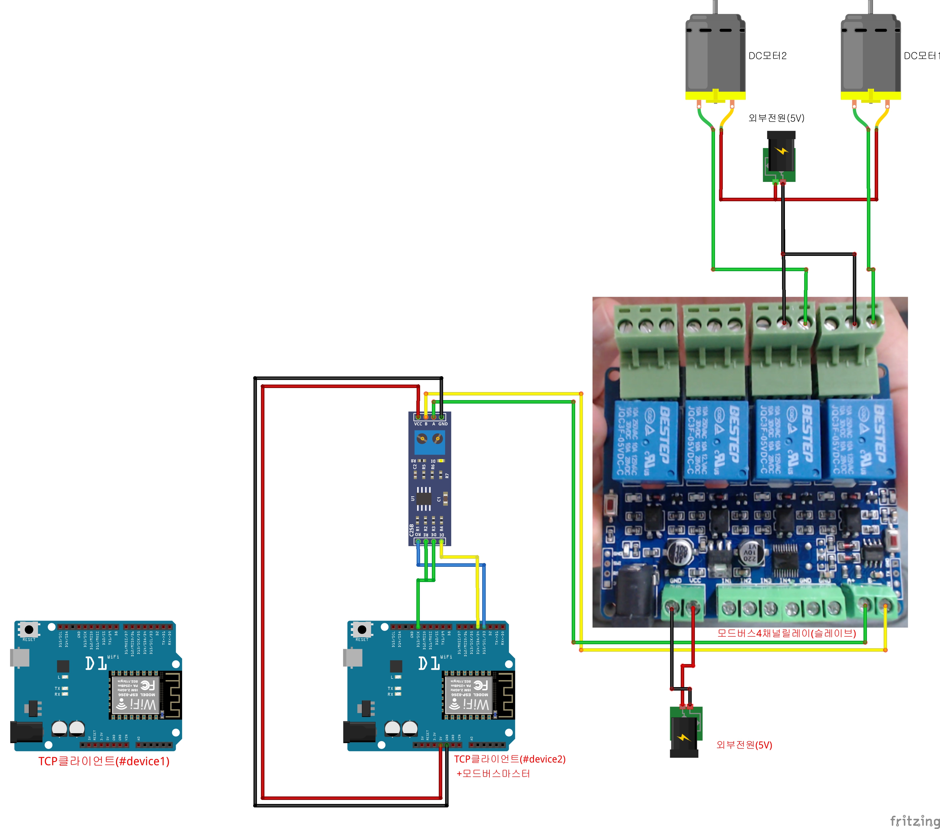 7.모드버스4채널 릴레이에 DC모터를 2개 달아서 버튼으로 제어해보는 예제!