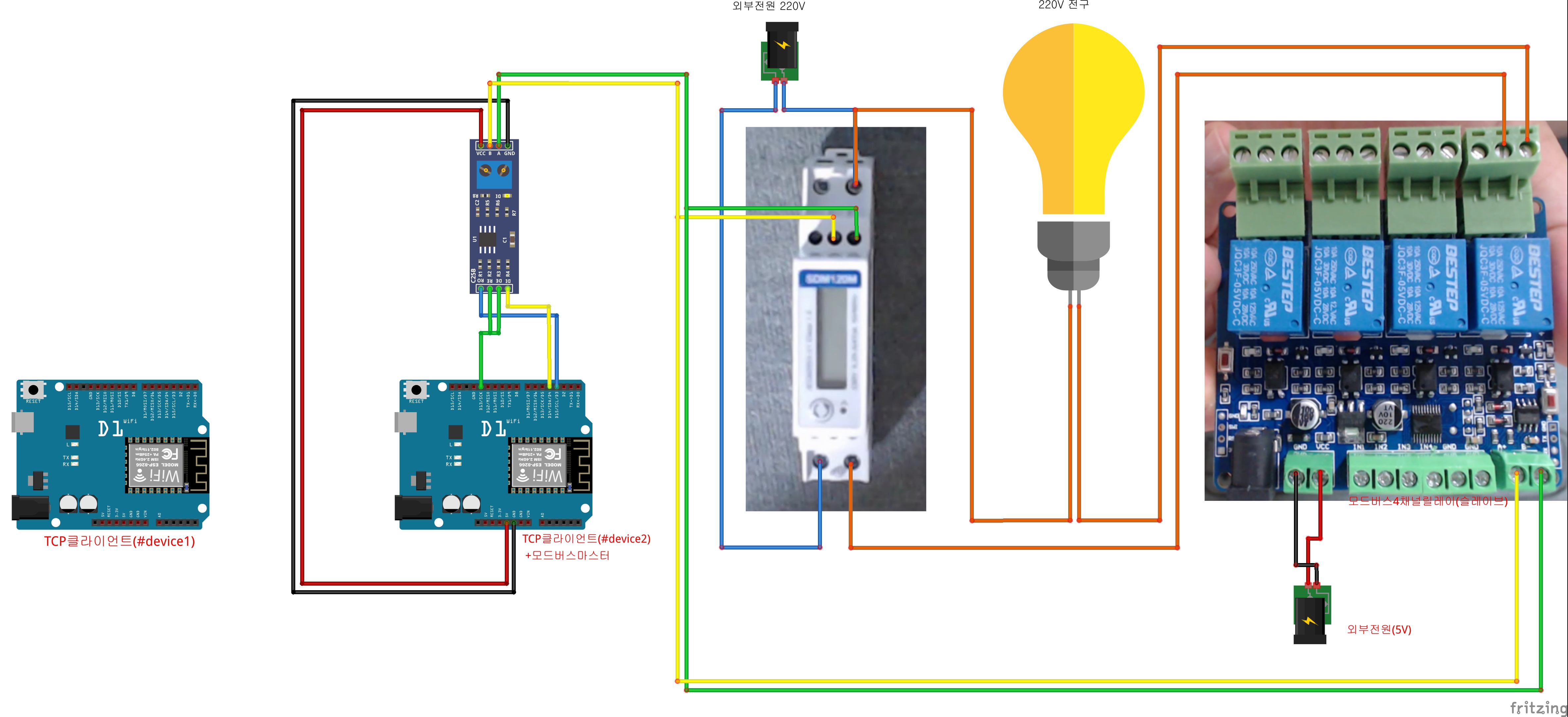 2.모드버스 마스터노드에 아이디0x01로 디지털 전력량계(SDM120)을 연결하고 아이디 0x02로 4채널 릴레이를 연결한다음 다른 TCP클라이언트에서 입력한 명령에 따라 220V전구를 4채널 릴레이를 이용해서 제어하고, 이때 디지털 전력량계에서 측정하는 값을 일정한 간격으로 요청해서 TCP클라이언트 시리얼 모니터에 출력하는 예제!