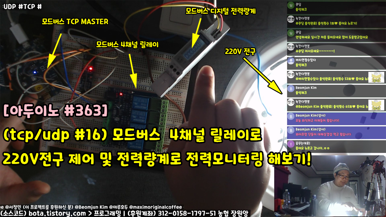 [아두이노#363] (tcp/udp #16) 모드버스 마스터 4채널 릴레이로 220V전구 제어 및 전력량계(SDM120)로 전력모니터링 해보기!(녹칸다/포로리야공대가자)