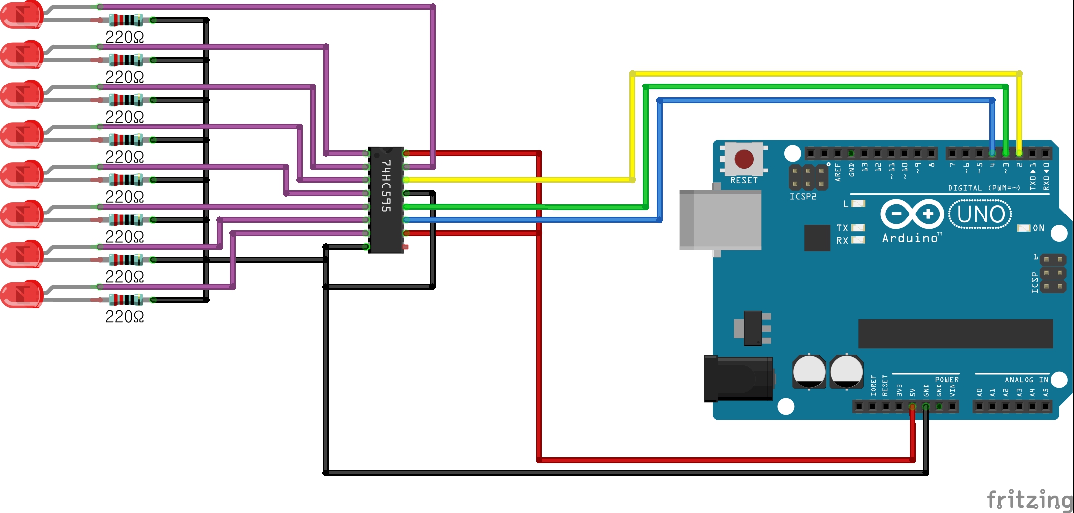 1.아두이노 우노에 74HC595와 LED8개를 연결한다음 제일 첫번째 LED만 켜질수 있도록 하시오!