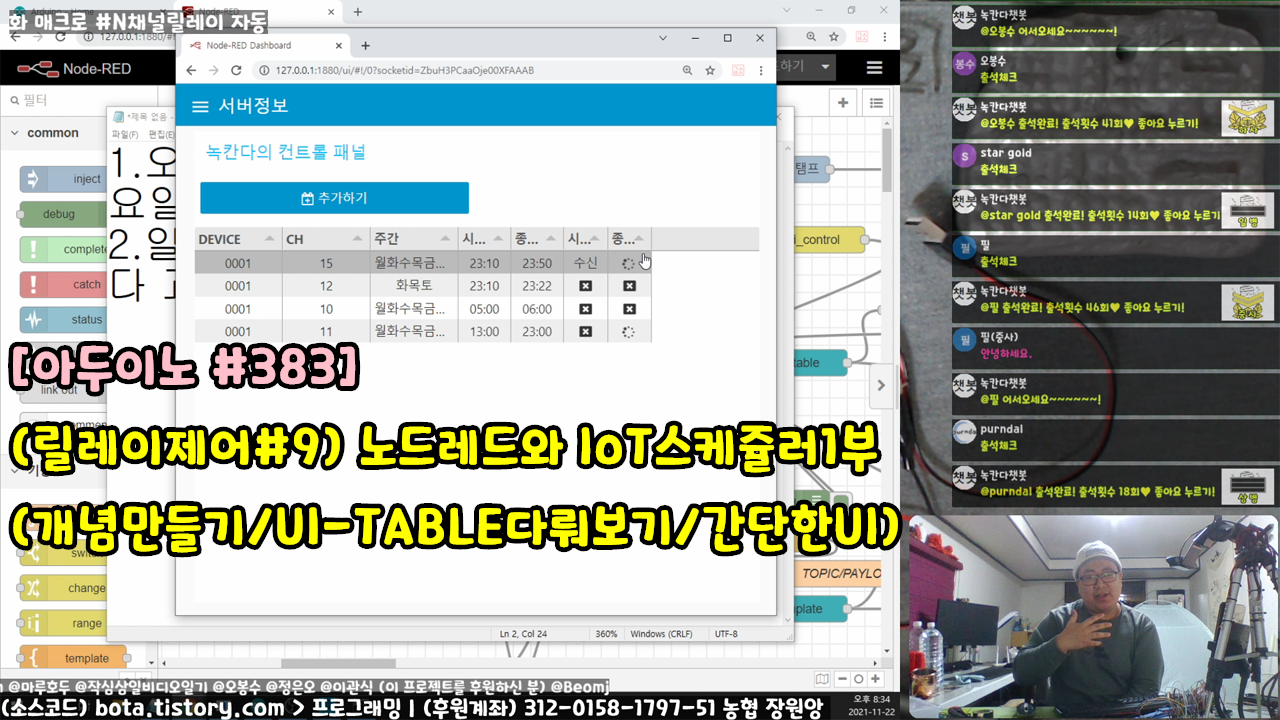 [아두이노#383] (릴레이제어#9) 노드레드(node-red)와 IoT스케쥴러1부(스케쥴링 개념만들기/UI-TABLE다뤄보기/간단한UI)(녹칸다/포로리야공대가자)