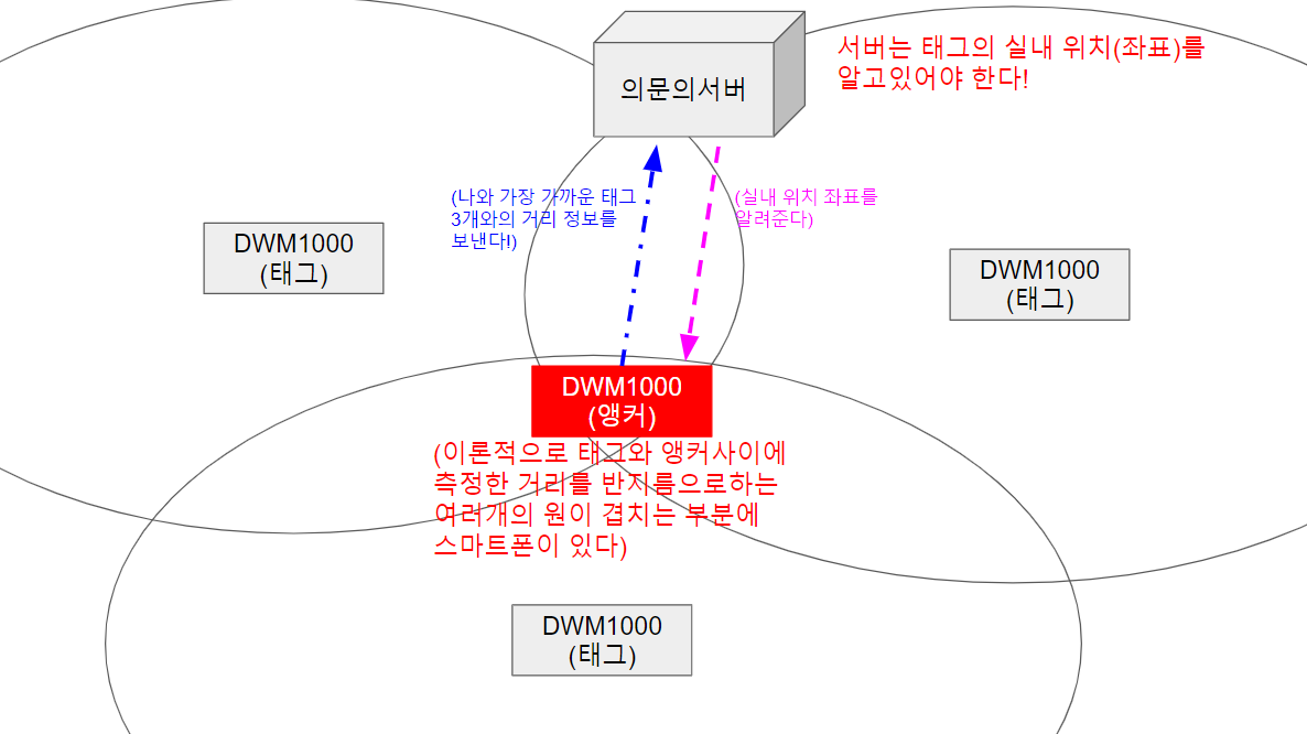위 사진은 녹칸다가 생각한 DWM1000을 이용한 실내 위치측위에 대한 개념도이다!