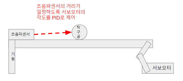 초음파센서를 이용해서 탁구공과 초음파센서가 지정된 거리를 유지하도록 서보모터의 각도를 PID제어해보는 내용!