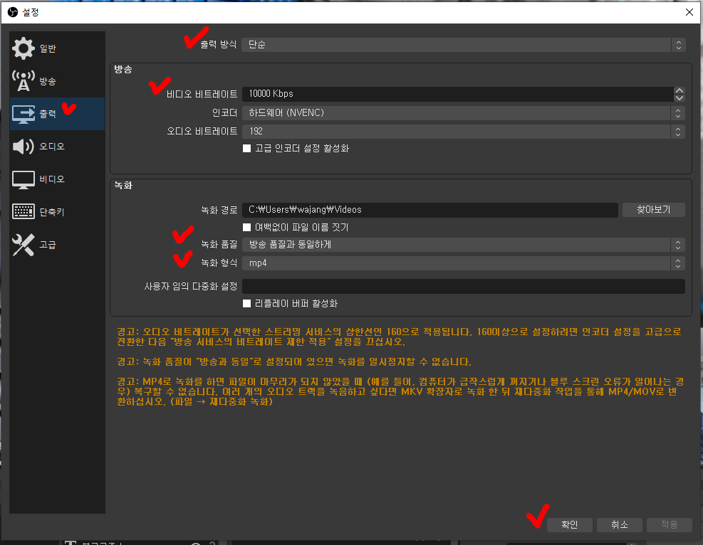 복잡하게 설정할 필요없이 "단순"으로 하시고 비디오 비트레이트를 10000Kbps라고 입력해줍니다~!