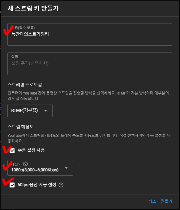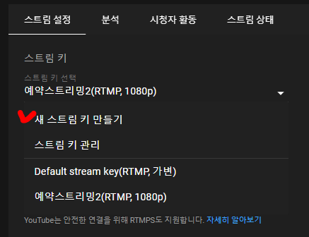 아래와 같이 라이브 관제소에서 스트림키를 새로 만듭니다!