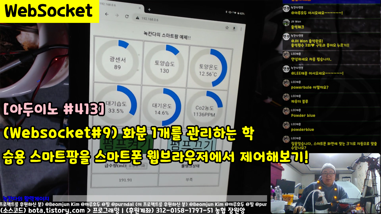 [아두이노#413] (Websocket#9) 화분 1개를 관리하는 학습용 스마트팜을 스마트폰 웹브라우저에서 제어해보기!(녹칸다/포로리야공대가자)