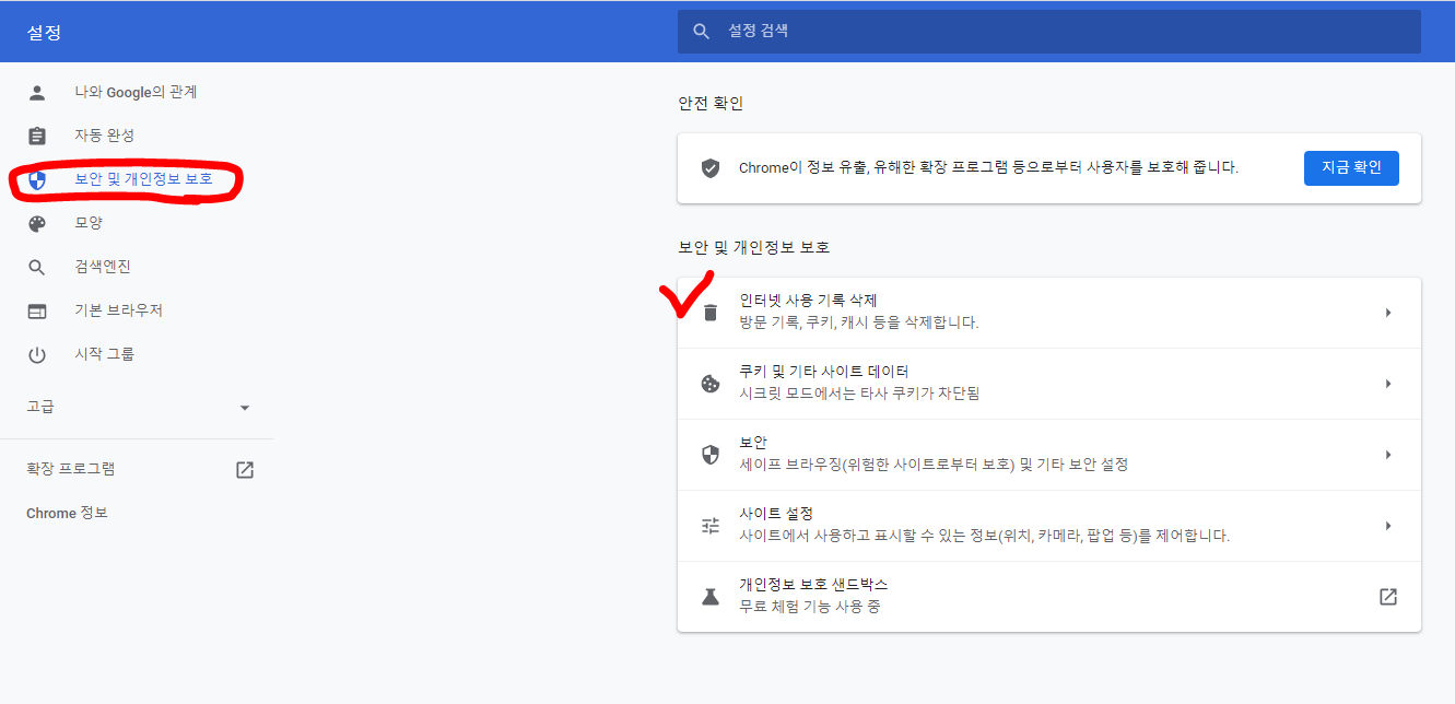 "보안 및 개인정보 보호"를 선택하시고 "인터넷 사용 기록 삭제"를 눌러줍니다!!