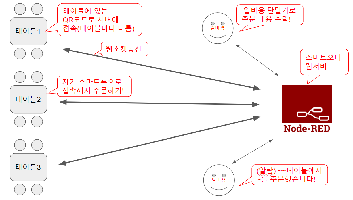 매장에 착석후 테이블에 있는 QR코드를 찍으면 노드레드 서버에 접속할 수 있는 url로 접속하고 이때 브라우저는 크롬이라고 가정함!