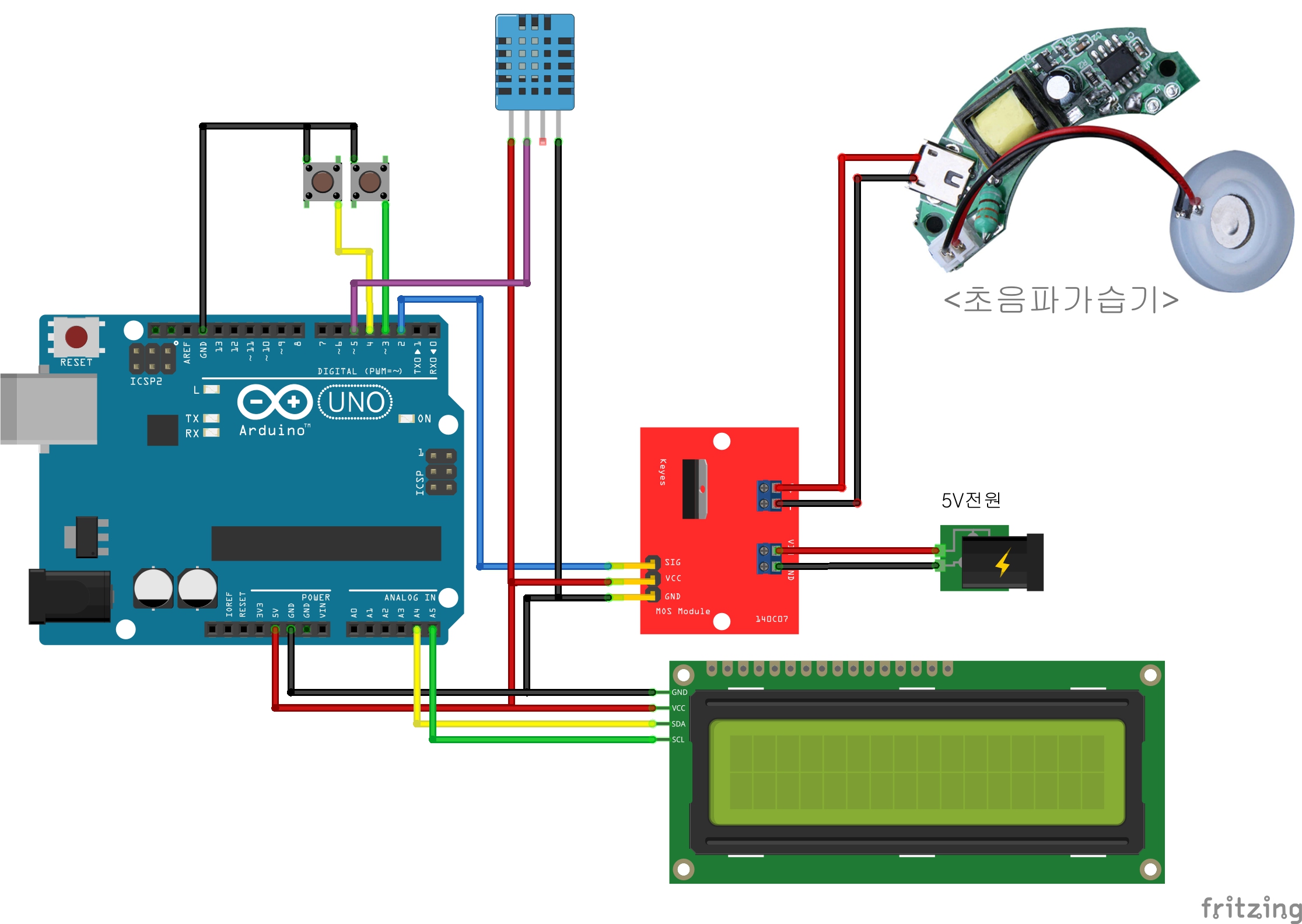 On/Off하는 버튼과 온습도센서를 연결하고 현재상태 출력을 위한 LCD를 배치해서 내가 직접 제어할 수 있는 가습기를 만들어보자!
