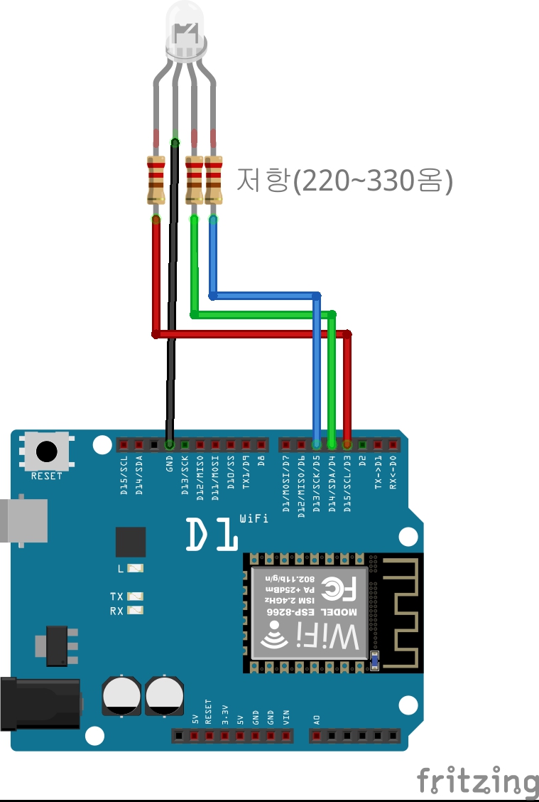5.ESP8266에 RGB LED를 1개 연결하고 버튼 3개를 UI에 추가해서 버튼을 누르면 빨간색, 녹색, 파란색이 켜지도록 하시오!