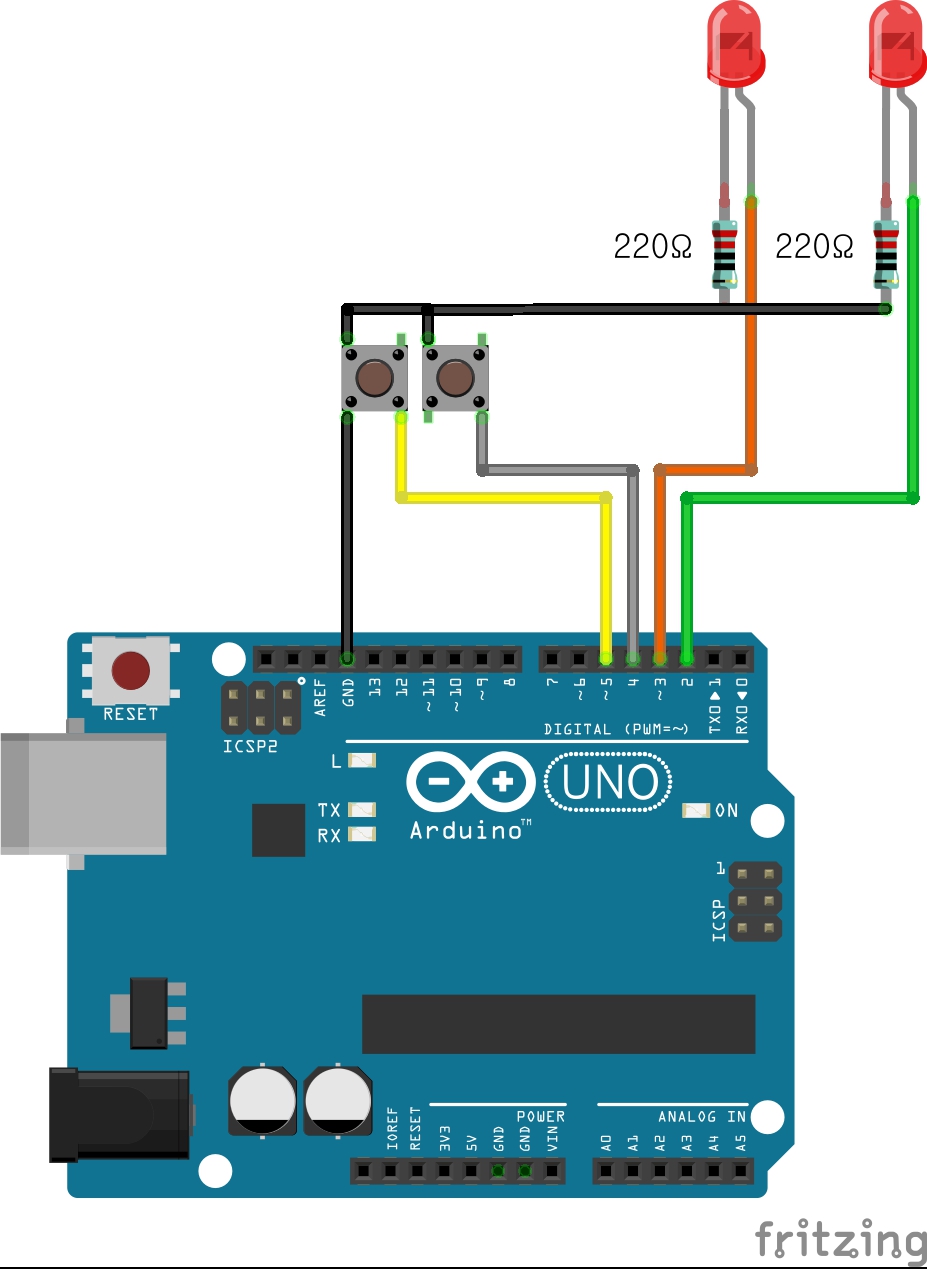 2.버튼2개 LED2개를 연결하고 1번버튼을 누르면 LED1번이 2초켜짐, 2번이 8초켜짐으로 동작하고 2번버튼을 누르면 led1번이 3초켜짐 2번이 7초켜짐으로 동작하시오!