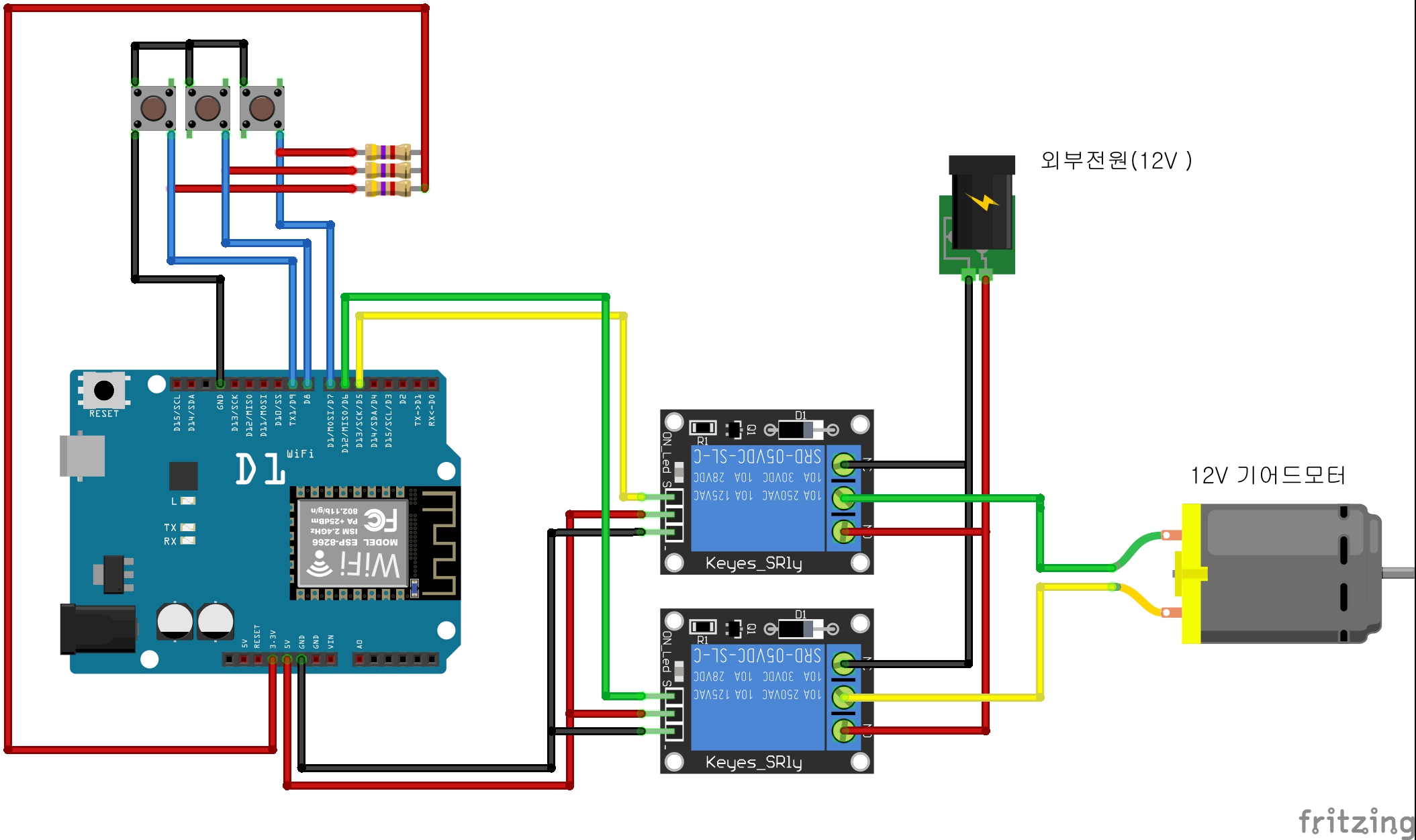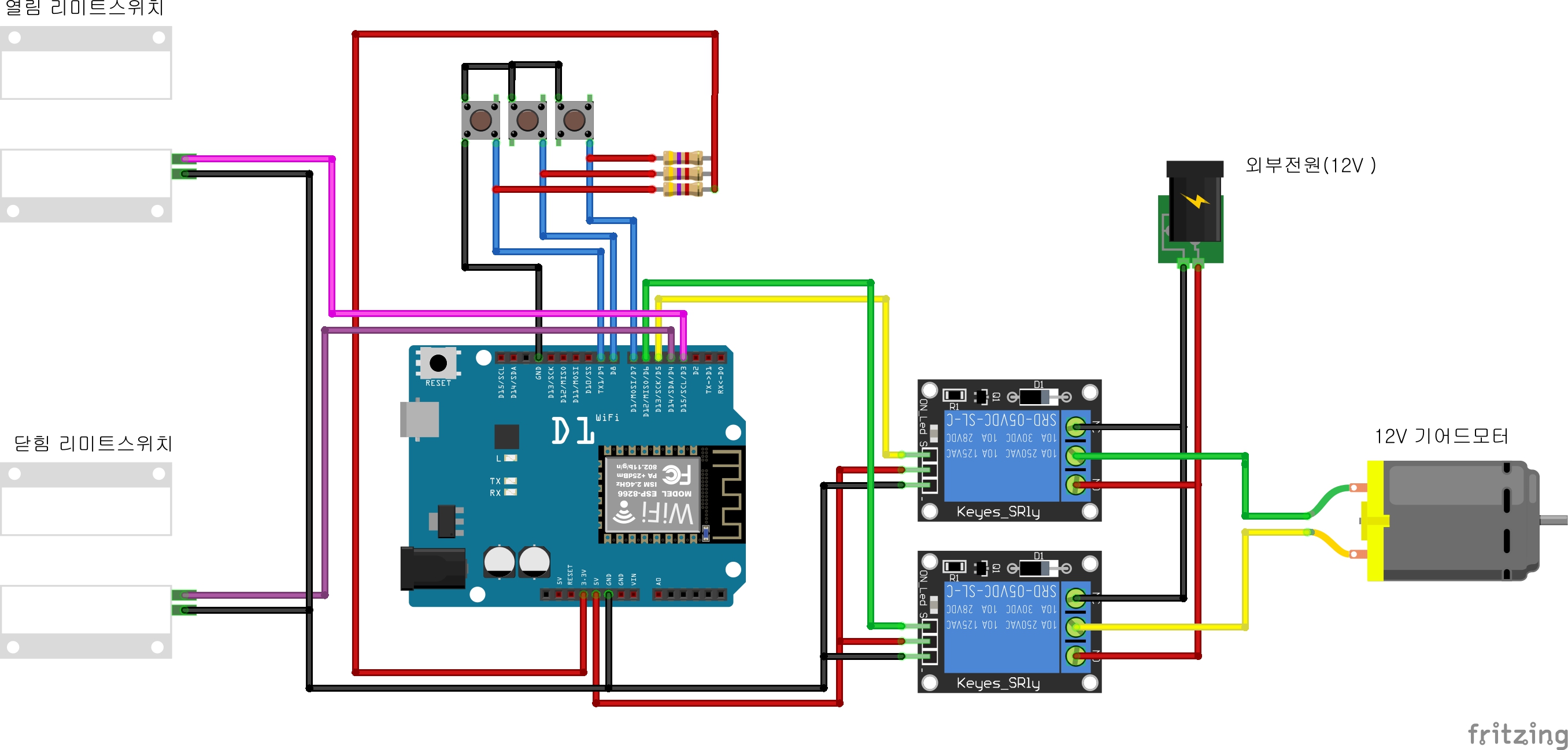 1.ESP8266에 2채널 릴레이와 12V감속모터를 연결하고 3가지 버튼을 생성해서 정방향, 역방향, 정지 기능을 구현하고 블라인드가 완전열리거나 닫힐때 까지의 시간을 측정하는 예제를 구현하시오!