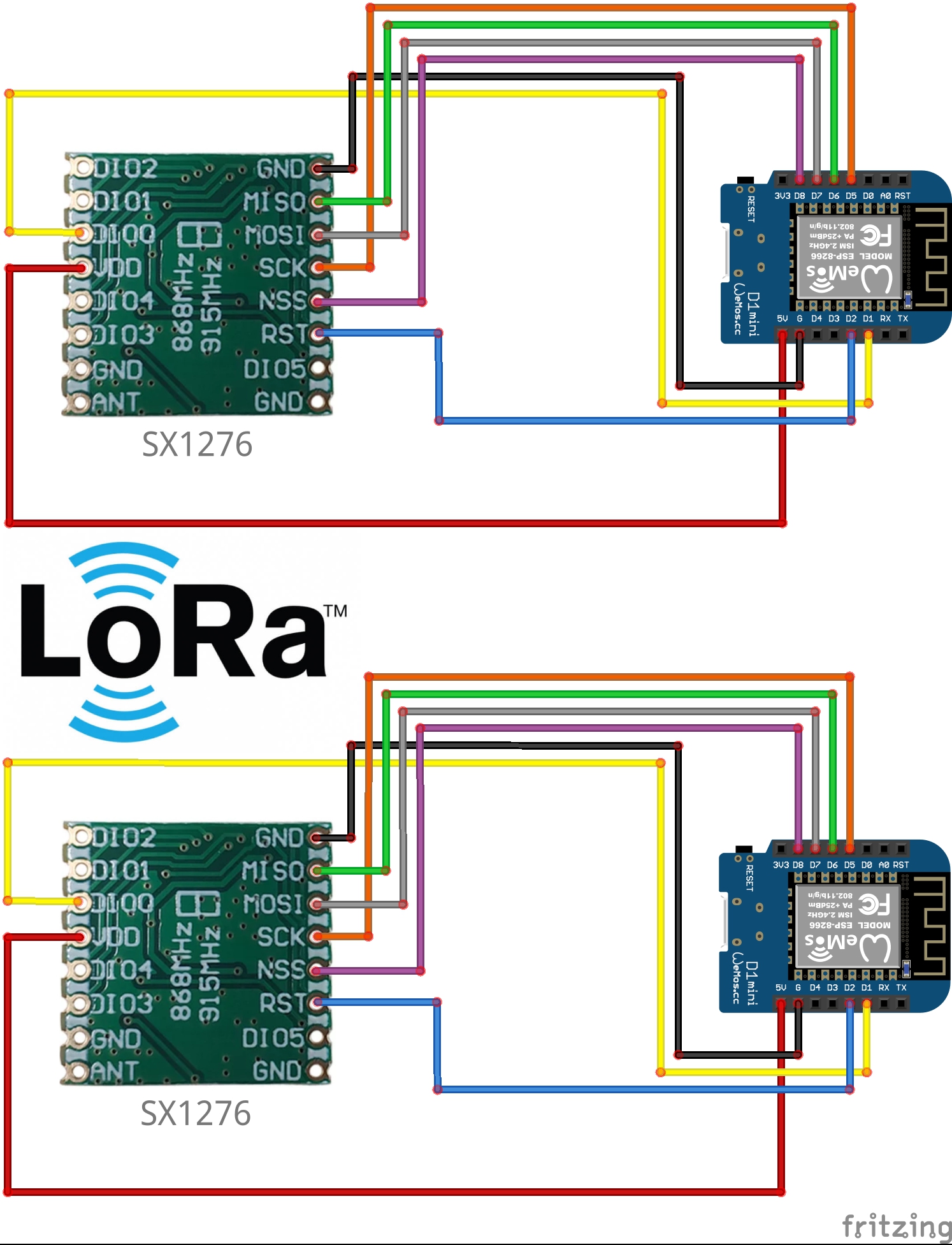 1.Wemos d1 mini보드에 sx1276모듈을 연결해서 게이트웨이와 노드로 구성된 2개의 보드가 양방향 통신이 되는지 확인하는 예제!
