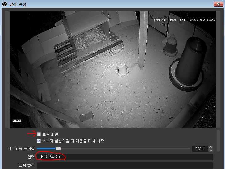 미디어소스에 로컬파일에 체크되어있는 것을 해제하고 입력부분에 사용하시는 IP CAM의 RTSP주소를 입력하면 아주 잘나옵니다~~!