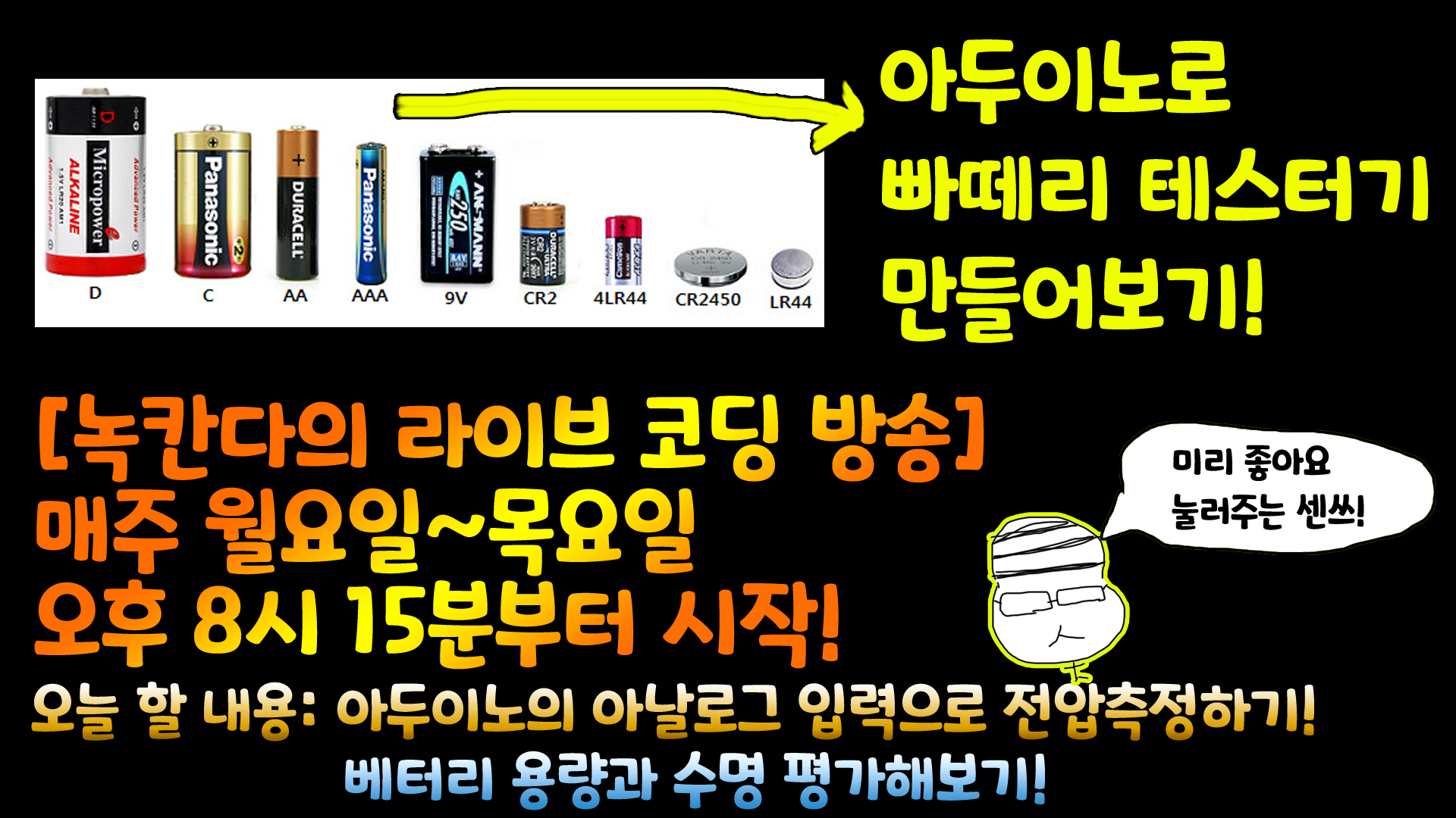 [아두이노#517] 건전지와 베터리 전압과 용량 측정해보기!(1.5V~12V) 건전지 테스터기 만들어보기!(녹칸다/포로리야공대가자)