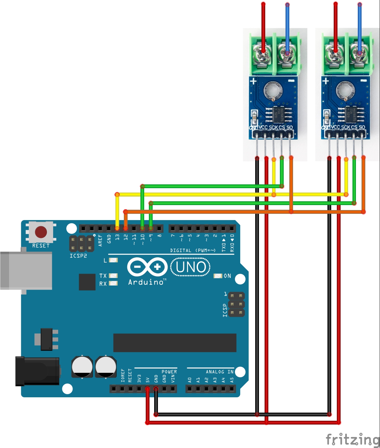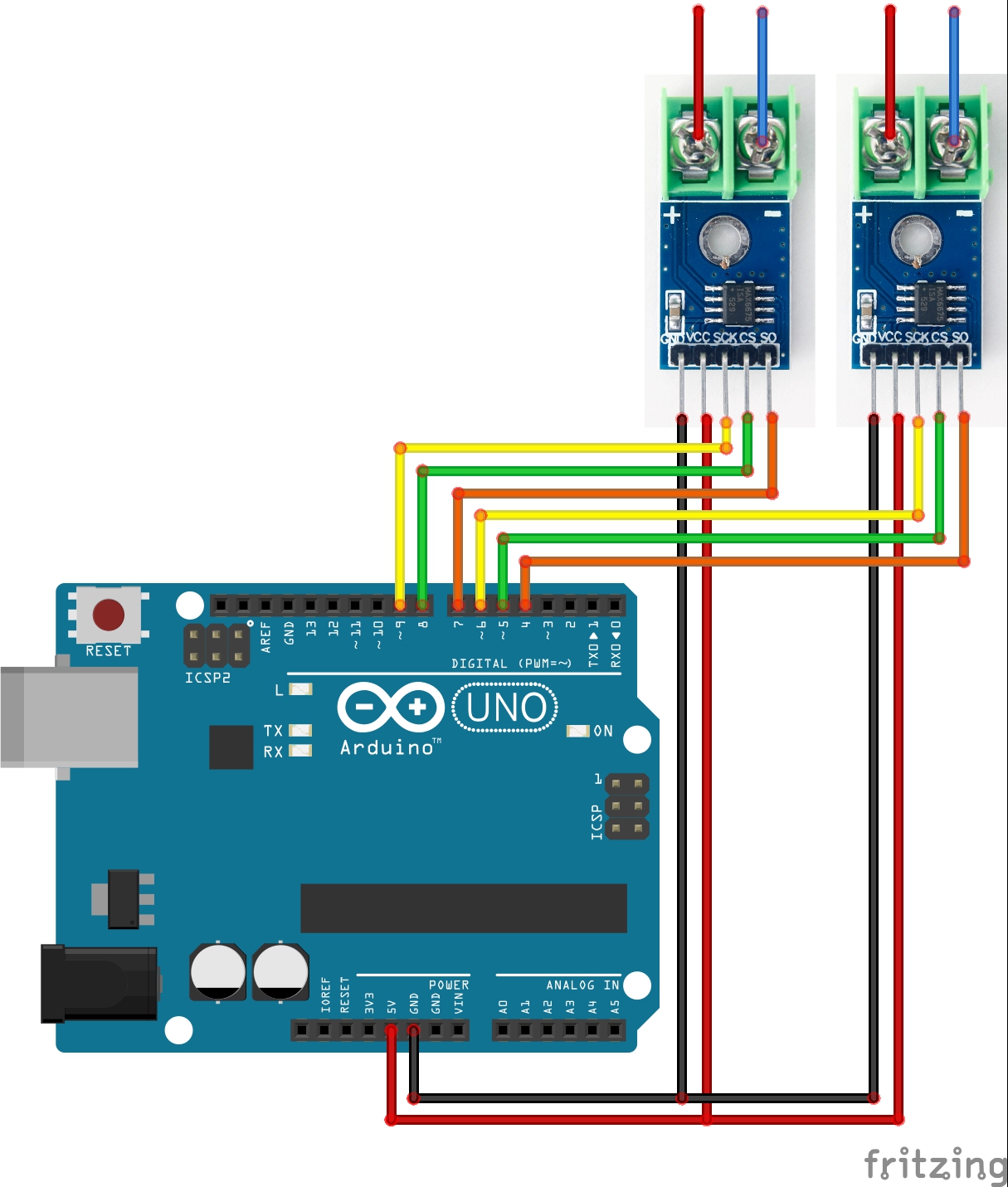 3.MAX6675모듈 2세트를 연결한다! S/W SPI방식을 사용하되 각각 3개의 핀씩 총 6개의 디지털핀으로 온도값을 출력하시오!